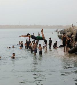 هربًا من حر الخيام.. أهالي #غزة يلجأون إلى البحر رغم تلوث مياهه بالصرف الصحي