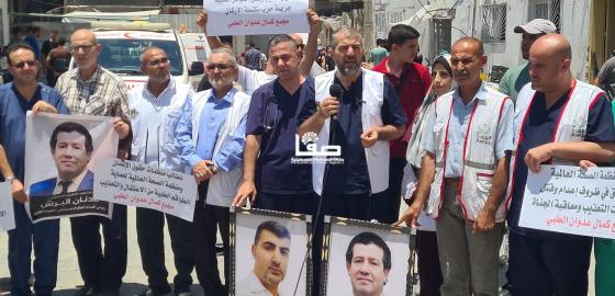 وقفة للكوادر الطبية في مستشفى كمال عدوان للمطالبة بإنقاذ الوضع الصحي في شمالي قطاع غزة واستنكارا لقتل الطبيبين د. إياد الرنتيسي و د. عدنان البرش في سجون الاحتلال جراء التعذيب 22 يونيو 2024