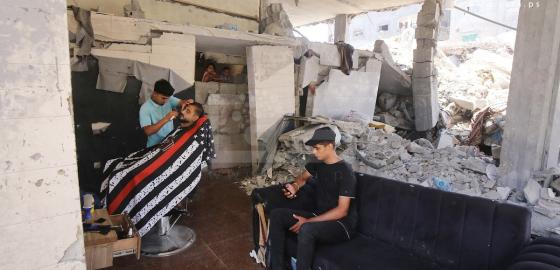 حلاق من مخيم البريج يعيد ترميم وتشغيل صالونه المدمر بفعل آلة الحرب الإسرائيلية المستمرة على قطاع غزة 24 يونيو 2024