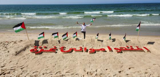 الحملة الدولية لكسر الحصار عن غزة تدشن لوحة رملية على شاطئ البحر بعنوان افتحوا موانئ غزة 28 سبتمبر 2023