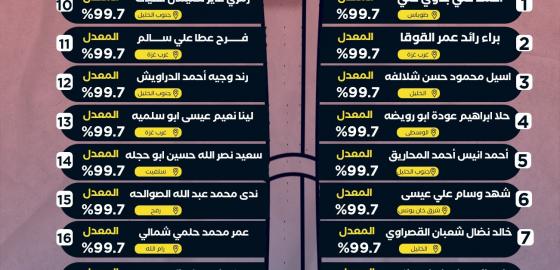 الطالبة آية إياد النجار من مخيم النصيرات الأولى مكرر على فلسطين في الفرع الأدبي بمعدل 99.6% 20 يوليو 2023