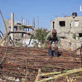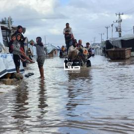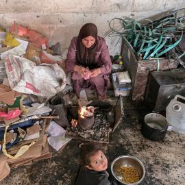 سيدة نازحة وأطفالها يعيشون ظروفًا صعبة في مدرسة مدمرة شرقي خان يونس جنوبي قطاع غزة بعد تدمير قوات الاحتلال منزلها 22 نوفمبر 2025