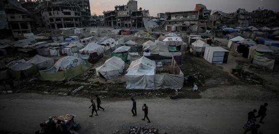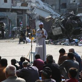 إقامة صلاة الجمعة في ساحة مدرسة أبو عاصي المدمرة في مخيم الشاطئ الشمالي غربي مدينة غزة 08 نوفمبر 2025