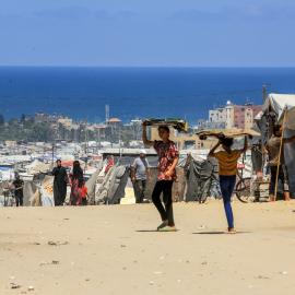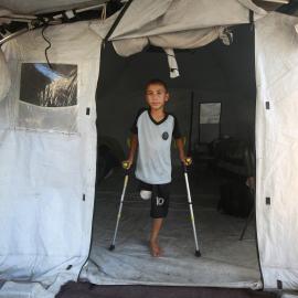 محمد مصلح (10 سنوات) فقد قدمه ويعيش مع والدته في خيمة بالجامعة الإسلامية المدمرة غربي مدينة غزة 09 يوليو 2025