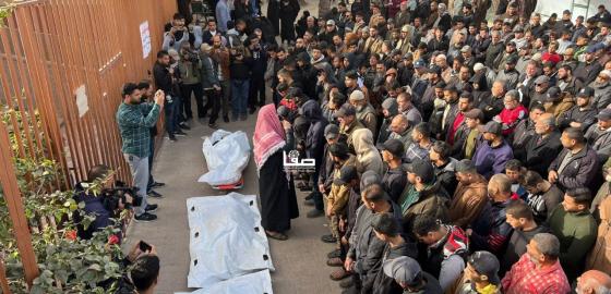 تشييع شهداء ارتقوا جراء قصف إسرائيلي استهدف مخيم جباليا شمالي القطاع فجر اليوم من مستشفى الشفاء بمدينة غزة 16 فبراير 2026