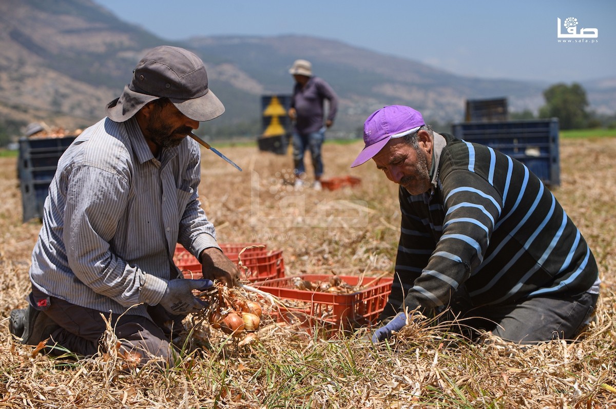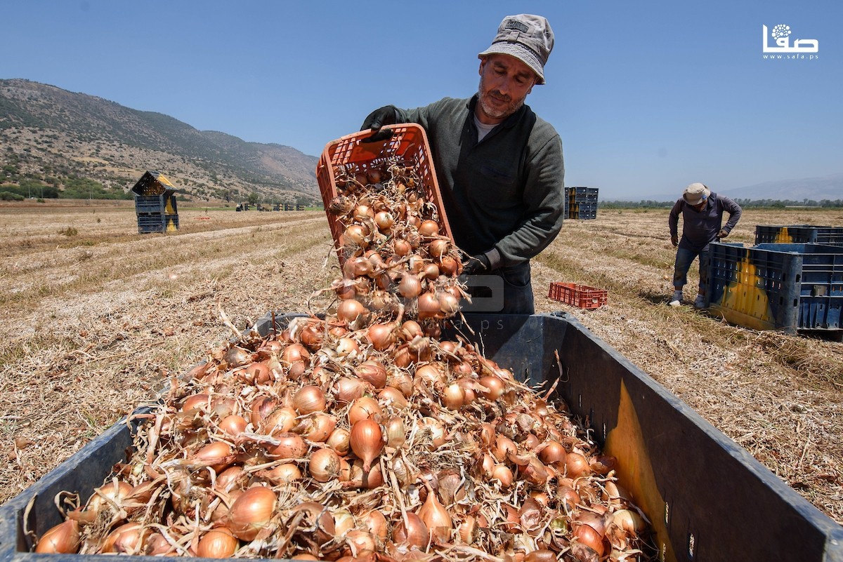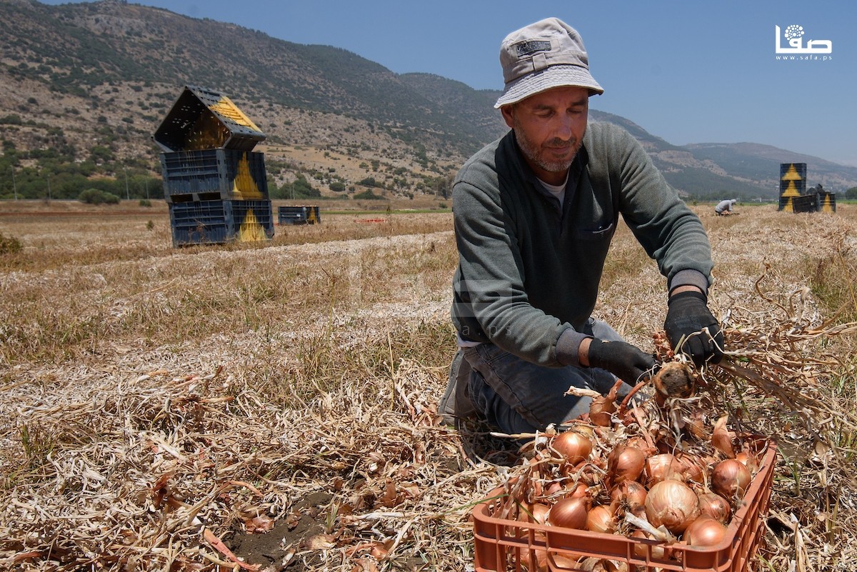 مزارعون يحصدون البصل في حقول وادي الحولة شمال الأراضي المحتلة