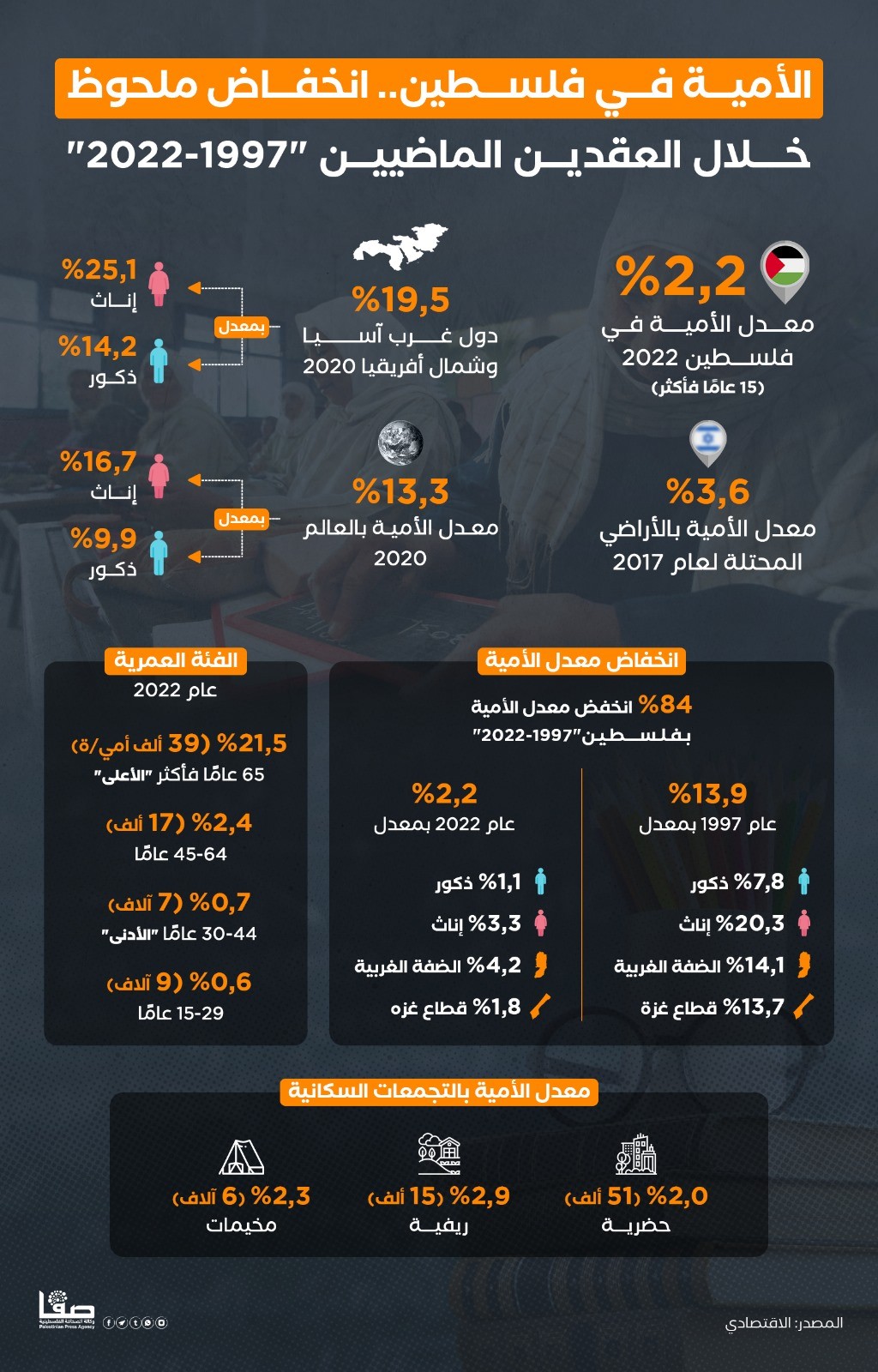 الأمية في فلسطين.. انخفاض ملحوظ خلال العقدين الماضيين "1997-2022"