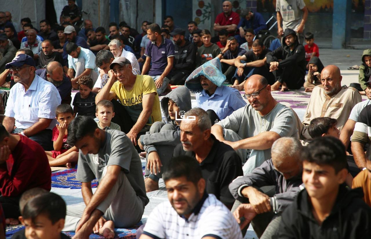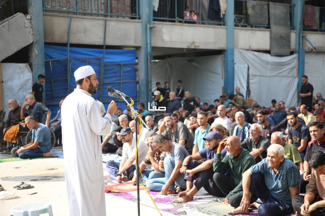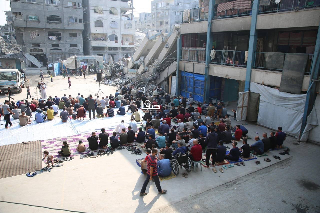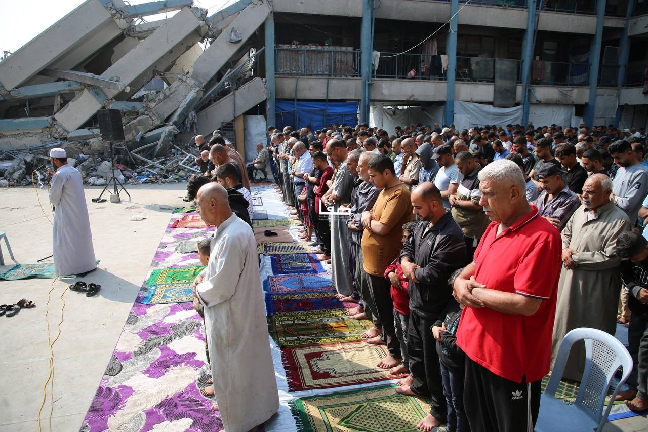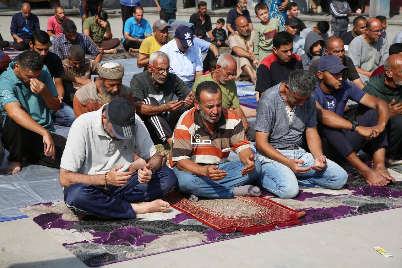 إقامة صلاة الجمعة في ساحة مدرسة أبو عاصي المدمرة في مخيم الشاطئ الشمالي غربي مدينة غزة