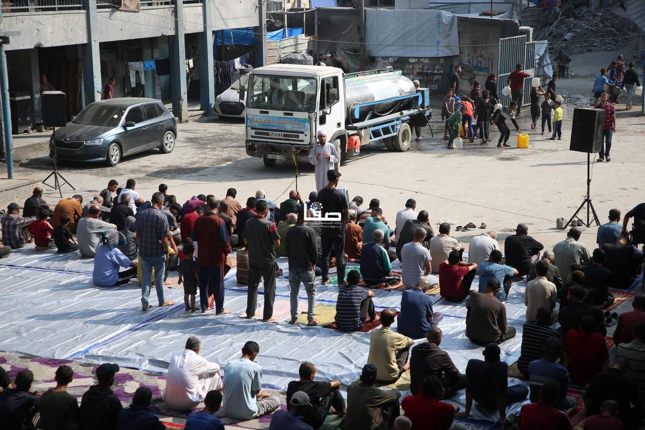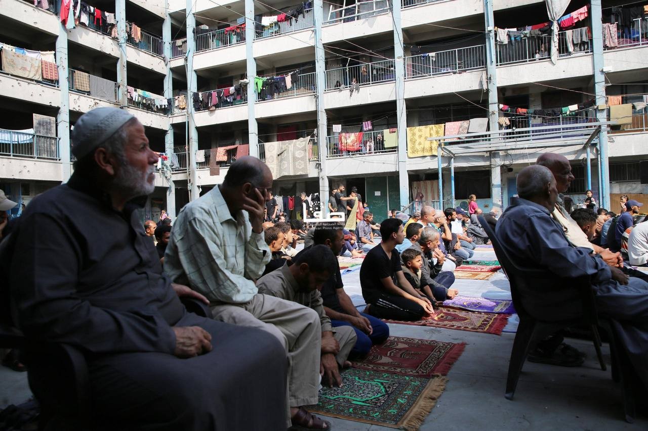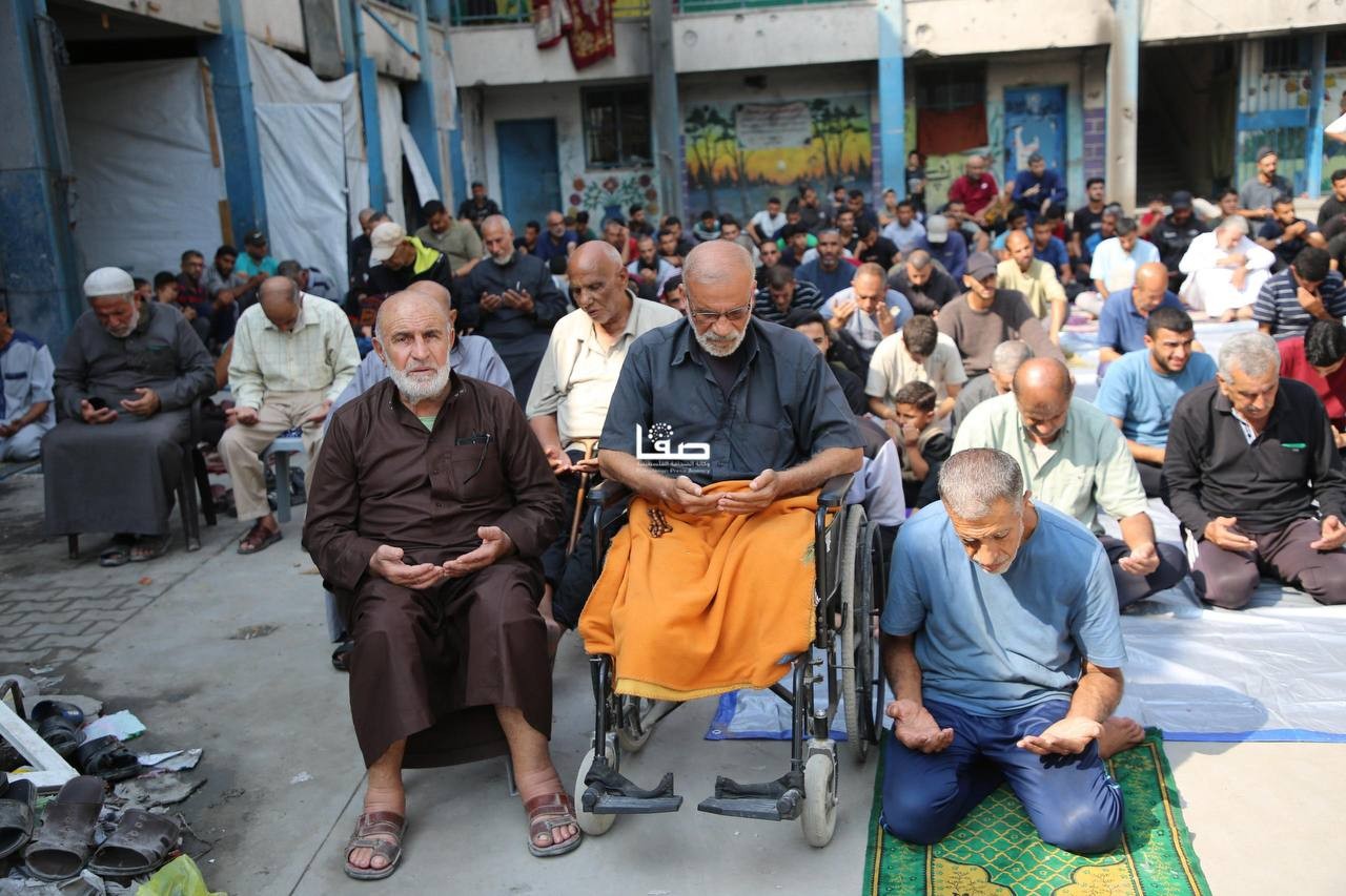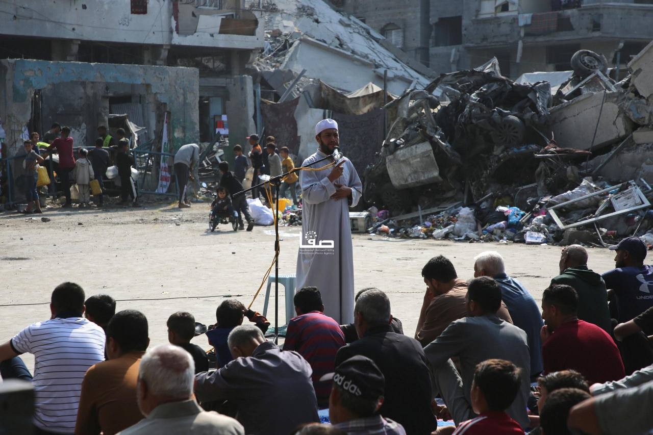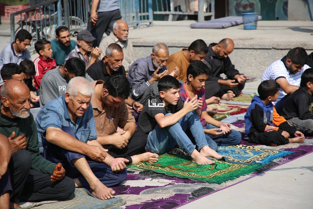 إقامة صلاة الجمعة في ساحة مدرسة أبو عاصي المدمرة في مخيم الشاطئ الشمالي غربي مدينة غزة