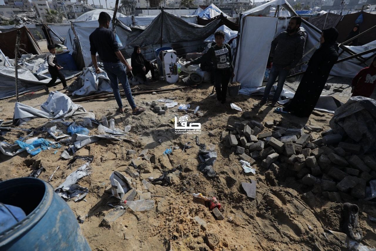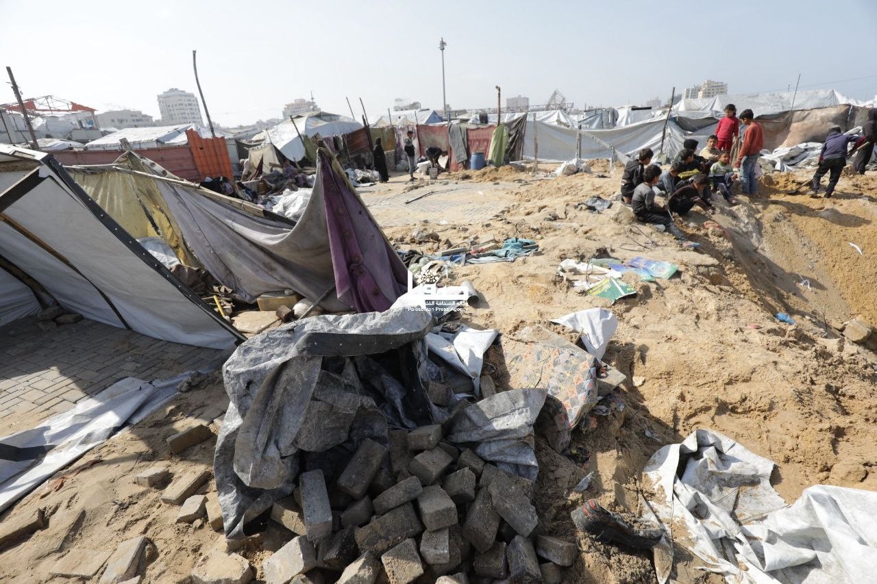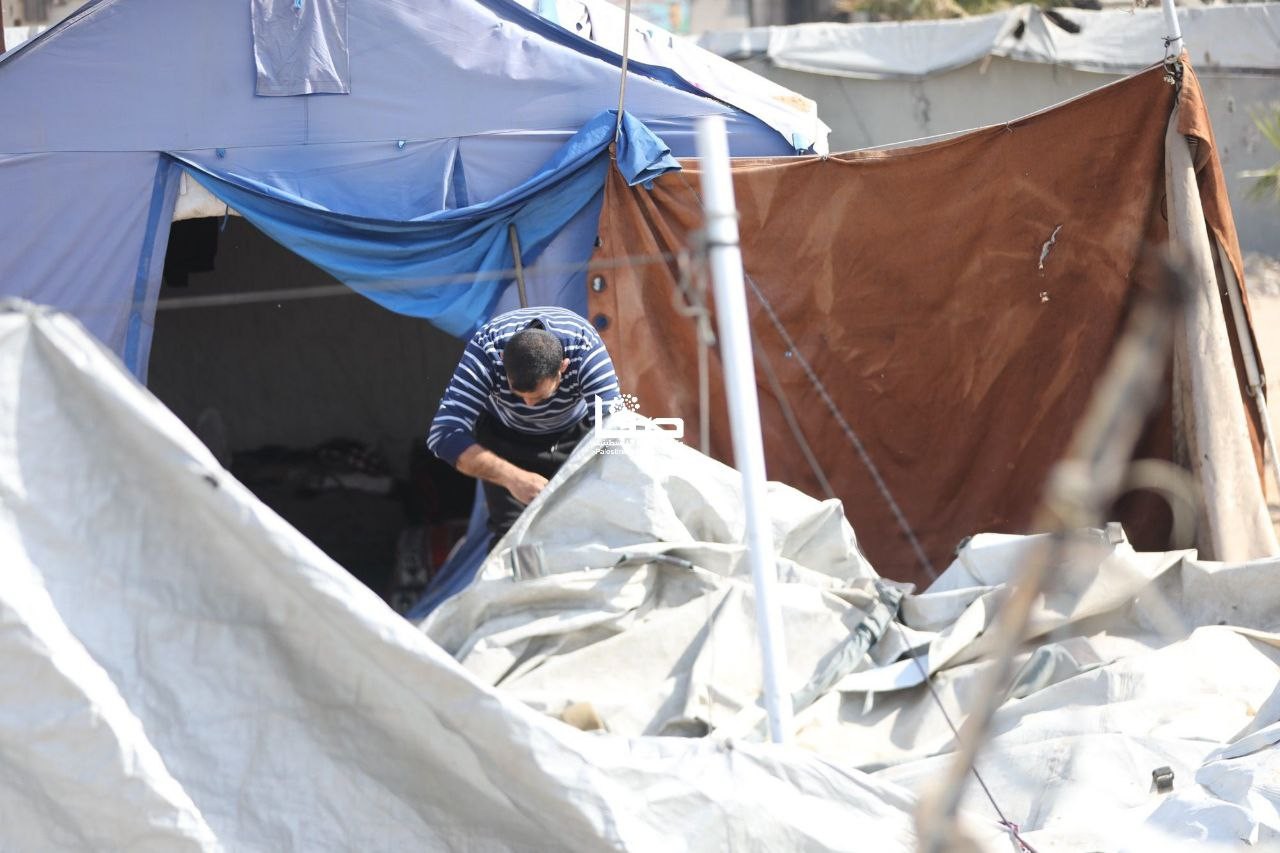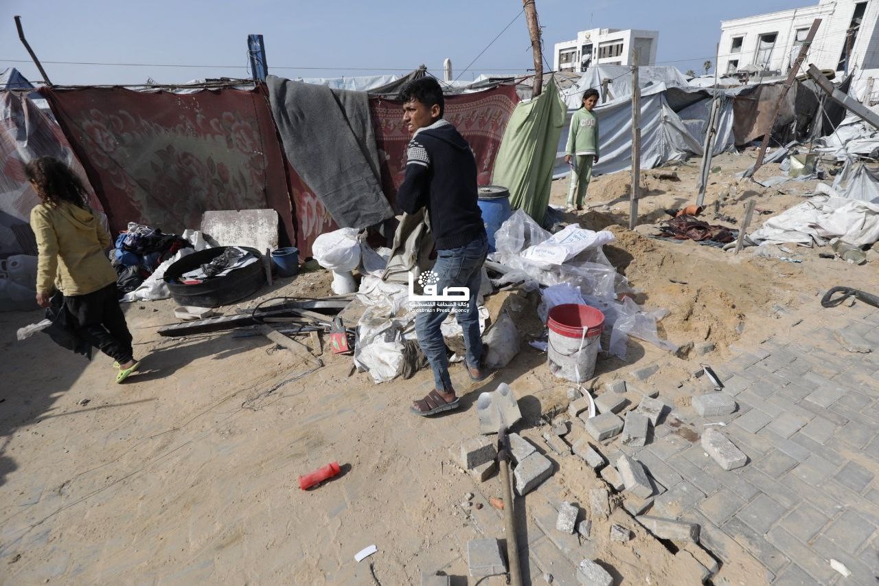 بعد قصف إسرائيلي استهدفه أمس.. نازحون يرمّمون الأضرار التي خلّفها القصف في مخيّم أنصار غربي مدينة غزة