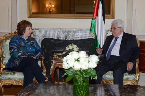 بحث الرئيس محمود عباس بالعاصمة الفرنسية باريس مع مفوضة العلاقات الخارجية في الاتحاد الأوروبي كاثرين آشتون والرئيس الفرنسي فرانسوا هولاند الخميس آخر المستجدات. ووضع الرئيس المسؤولة الأوروبية والرئيس الفرنسي في صورة آخر مستجدات التسوية السياسية والمفاوضات مع الاحتلال الإسرائيلي برعاية أميركية. كما بحث معهما الأوضاع في المنطقة وأهمية تعزيز التعاون المشترك بين فرنسا وفلسطين، وتعزيز العلاقات الثنائية. وحضر الاجتماع عضو اللجنة التنفيذية لمنظمة التحرير الفلسطينية صائب عريقات، وعضو اللجنة المركزية لحركة 'فتح' محمد اشتية، والناطق الرسمي باسم الرئاسة نبيل أبو ردينة، ومستشار الرئيس للشؤون الدبلوماسية مجدي الخالدي، وسفير فلسطين لدى فرنسا هايل الفاهوم.