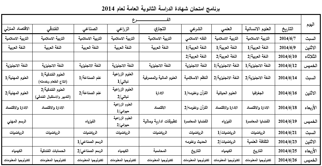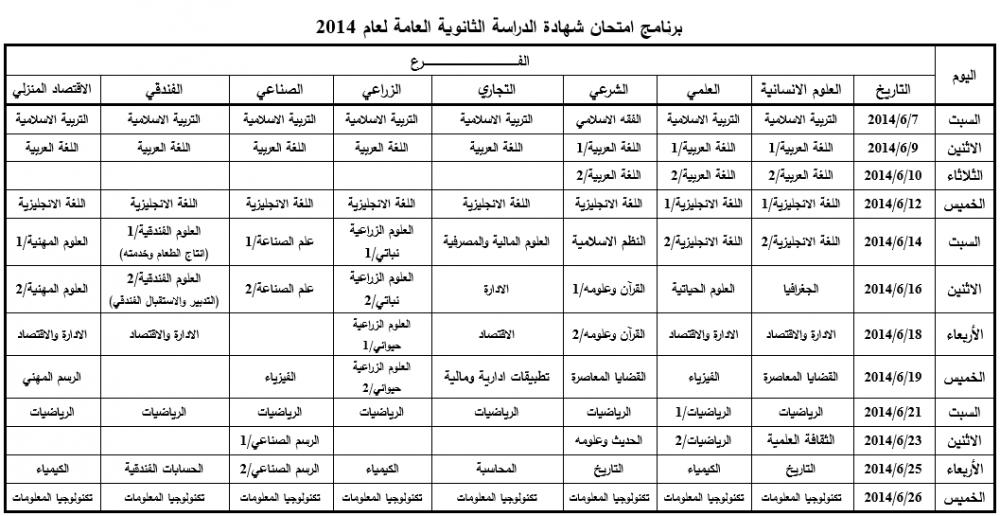 أعلنت وزارتا التربية والتعليم العالي في قطاع غزة والضفة الغربية المحتلة عن موعد امتحانات الثانوية العامة "التوجيهي" لعام 2014، والذي سيبدأ في السابع من حزيران المقبل. وقالت الوزارتان إن عدد الطلبة النظاميين الذين سيتقدمون للامتحان يقدر بنحو 70 ألف طالب وطالبة في الضفة وقطاع غزة في مختلف الفروع. وسيبدأ برنامج الامتحانات يوم الاثنين بمبحث التربية الإسلامية، وسينتهي الخميس الموافق السادس والعشرين من حزيران، بمبحث تكنولوجيا المعلومات. [bimg=032014/re_1393846456.jpg]..[/bimg]