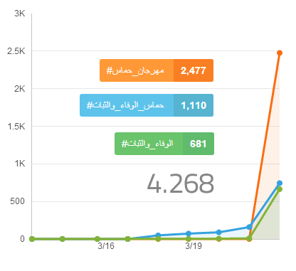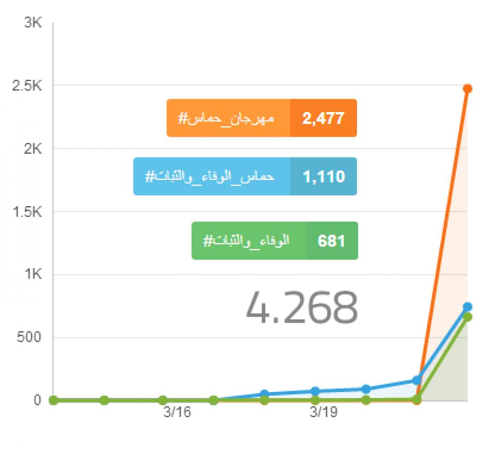 لا يزال هاشتاق #مهرجان_حماس معتصمًا في ساحة موقع التواصل الاجتماعي رغم مرور نحو 24 ساعة على المهرجان الذي أقامته الحركة بذكرى استشهاد ثلة من مؤسسيها في ساحة السرايا وسط مدينة غزة. وتصدر الهاشتاق المذكور المشهد على الساحة الفلسطينية محققًا المركز الأول في "تويتر"، بحسب مواقع متخصصة في ذلك، كما وصل إلى 22 مليون متابع في مختلف أنحاء العالم. وبلغت عدد تغريدات الهاشتاق 5.800، و1200 على هاشتاق #حماس_الوفاء_والثبات، فيما كانت الفترة الزمنية الأكثر نشاطًا هي ما بين الساعة العاشرة صباحًا والثالثة عصرًا، كما يقول المدون والناشط خالد صافي. وبدأ الهاشتاق نشيطًا قبل بدأ المهرجان في إشارة إلى أهمية الحدث الذي انتظره الجمهور لمعرفة موقف الحكومة الفلسطينية في غزة وحركة حماس من الأحداث المتسارعة محليًا واقليميًا، والاستماع للرسائل الموجهة من خلاله. وتداول نشطاء الإعلام الجديد صورًا عديدة عن المهرجان في مواقع التواصل الاجتماعي، وحظي مشهد ساحة السرايا وهي تكتظ بالجماهير على الصورة الأكثر تداولًا بين المغردين، تلتها صورة مؤسس حركة حماس الشهيد أحمد ياسين، ثم أعلام مصر داخل المهرجان. وكانت أكثر الكلمات ذكرًا في الهاشتاق: غزة- هنية- المقاومة- فلسطين- حماس- مصر- حماس_الوفاء_والثبات- نعترف– الوزراء. [img=032014/re_1395659002.jpg]صعود الهاشتاق[/img] ومن أبرز المغردين على هاشتاق #مهرجان_حماس، الداعية الشهير الشيخ نبيل العوضي, والداعية الشيخ حامد العلي، وعضو رابطة علماء المسلمين الدكتور محمد عبد الله الهبدان، بينما توزعت التغريدات على مختلف الدول في العالم. وشاركت جماهير غفيرة أمس في مهرجان "الثبات والوفاء للقادة الشهداء" الذي نظمته حماس في ساحة السرايا وسط غزة، بذكرى استشهاد قادتها، واعتبرت حجم الجماهير بمثابة "رسالة لكل المراهنين على إضعافها". وكانت الكلمة الرئيسية بالمهرجان الذي حضرته قيادات من الفصائل الفلسطينية المختلفة، لنائب رئيس المكتب السياسي لحماس رئيس الحكومة بغزة إسماعيل هنية تحدث فيها عن القضية الفلسطينية والمصالحة والمقاومة والعلاقة مع الخارج.