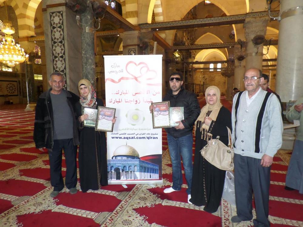 شهد شهر مارس الماضي عقد 26 قرانًا في المسجد الأقصى المبارك للمقدسيين والداخل الفلسطيني ضمن مشروع عقود القران برعاية مؤسسة "عمارة الأقصى والمقدسات". وقالت المؤسسة في بيانٍ لها الأربعاء أن المشروع يهدف لإحياء المسجد الأقصى ومباركة الأزواج في خطوتهم الأولى نحو حياة زوجية مشتركة. ونقلت المؤسسة عن الشابين محمد ماجد شويكي وأمل خالد الجيلاني أن عقد قرانهما بداية حياة مشرقة تنطلق من الأقصى." في حين قال خالد جمال عطية وسهاد رشيد درويش إن شعورهما لا يوصف ويملؤه النور والبهاء بعقد قراننا في المسجد الأقصى"، داعين المقبلين على الزواج على مباركة قرانهم في المسجد المبارك. أما إبراهيم محمود عميرة وحنان ابراهيم جابر فأكدا أنهما يشعران بمعاني البركة تتجسد واقعًا فعليًا في تكوين الأسرة ونواتها المسجد الأقصى المبارك وإنه مشروع مبارك يفرح المؤمنين ويعطي الشعور بالأمن والطمأنينة والمودة والرحمة". إبراهيم محمد الشيخ و حنين محمد الرموني:"عرفنا عن هذا المشروع عبر صفحة الفيسبوك وننصح المقبلين على الزواج بعقد قرانهم في المسجد الأقصى وأن ينطلقوا من هذا المكان لما يعطي من شعور بالطمأنينة والتوفيق".