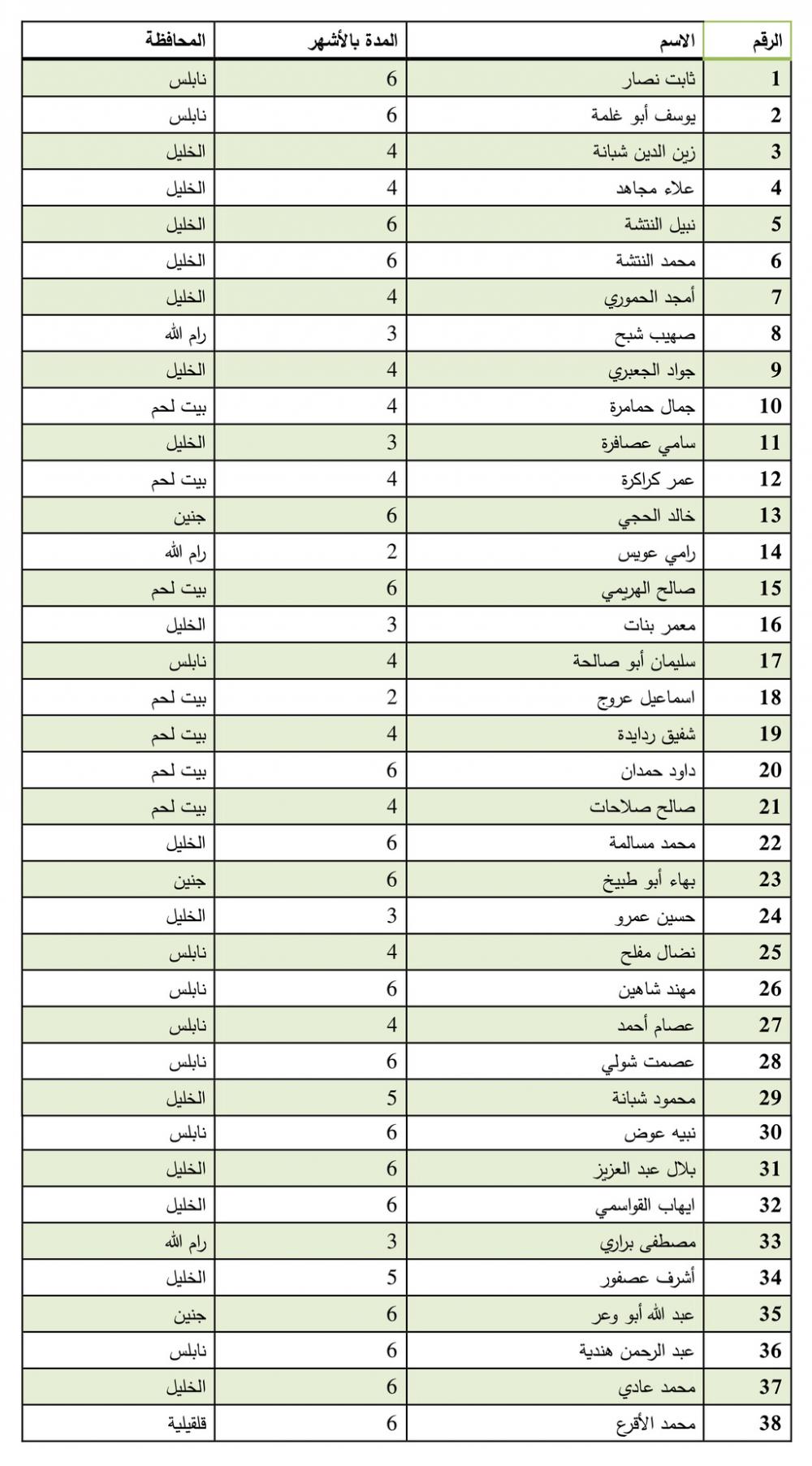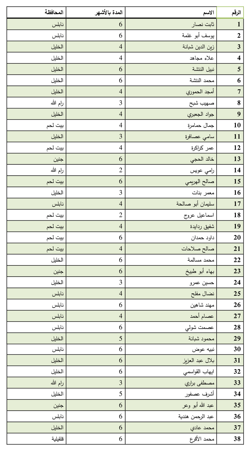 قال نادي الأسير الفلسطيني إن سلطات الاحتلال أصدرت (38) أمراً إدارياً ما بين أوامر جديدة وأوامر تجديد، خلال شهر آذار المنصرم. وأوضح النادي في بيان صحفي أن (18) أسيراً صدر بحقهم أمر إداري لمدة ستة شهور، و(11) أسيراً صدر بحقهم أمر إداري لمدة أربعة شهور، و(5) أسرى صدر بحقهم أمر إداري لمدة ثلاثة شهور، فيما أصدر أمران إداريان لمدة شهرين بحق أسيرين، وأمران إداريان لمدة خمسة أشهر بحق أسيرين. وفيما يلي أسماء المعتقلين: [bimg=042014/re_1396855532.jpg]..[/bimg]