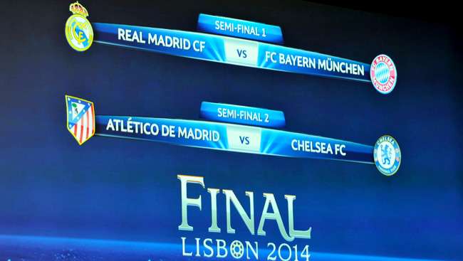 أسفرت قرعة الدور قبل النهائي لبطولة دوري أبطال أوروبا لكرة القدم التي سحبت في مدينة نيون السويسرية عن صدام قوي بين ريال مدريد الإسباني وبايرن ميونيخ الألماني حامل اللقب في تكرار لسيناريو 2012، بينما وضعت القرعة تشيلسي الإنجليزي وجها لوجه أمام أتليتكو مدريد الإسباني. وشارك في سحب القرعة التي جرت في مدينة نيون السويسرية النجم البرتغالي لويس فيجو سفير اللقاء النهائي. ويقام ذهاب هذا الدور يومي 22 و23 من أبريل الجاري على ملعب الفريق المذكور أولاً، على أن تقام مباراة العودة يومي 29 و30 من الشهر ذاته، بينما يقام نهائي البطولة يوم 24 مايو المقبل على ملعب النور بالعاصمة البرتغالية لشبونة. كما أسفرت قرعة الدور قبل النهائي لبطولة الدوري الأوروبي عن مواجهة إسبانية خالصة بين إشبيلية وفالنسيا، فيما يصطدم يوفنتوس الإيطالي ببنفيكا البرتغالي. ويقام ذهاب الدور قبل النهائي يوم 24 أبريل الحالي على ملعب الفريق الأول، والعودة يوم الأول من مايو القادم، ويقام النهائي في ملعب يوفنتوس أرينا بمدينة تورينو الإيطالية يوم 14 مايو.