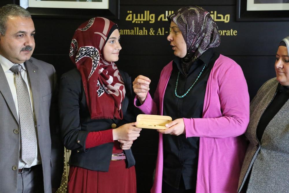 كرمت محافظ رام الله والبيرة ليلى غنام الأحد، الطالبة في مدرسة بنات (ترمسعيا) آية محمود ضميدي لحصولها على المرتبة الثانية ضمن مسابقة التحدث والخطابة باللغة العربية الفصحى والإلقاء الشعري التي أقيمت في القاهرة مؤخرا. وأكدت غنام خلال استقبالها اليوم للطالبة آية بحضور مدير التربية والتعليم أيوب عليان ورئيس بلدية ترمسعيا ومديرة مدرستها، أن آية تعبر بصوتها وثقافتها عن شعب صاحب حق لا يمكن أن يندثر. وأِشادت غنام بمديرية التربية وجهدها المتميز والملموس والإنجازات الواضحة التي خلقت فرص للإبداع والتميز، مكرمة أيضا مديرة المدرسة لجهدها وتميزها كمربية فاضلة. وأكدت على أن التعويل الفلسطيني هو على العقول البشرية النيرة التي ستحقق طموحات شعبنا، مشيرة أن تفوق الطالبة على المستوى العربي تأكيد على أنها ستكون رائدة من رائدات فلسطين اللواتي يثبتن أنفسهن في كافة الميادين. بدوره شكر والد الطالبة آية المحافظ غنام على مبادرتها بتكريم ابنته ما يشكل حافزا ايجابيا للتقدم والتطور الذي زرعه في نفس أبنائه، لافتا إلى أن الأسرة والمدرسة ومؤسسات المجتمع شركاء لتنمية أجيالنا وتربيتهم تربية وطنية سليمة.