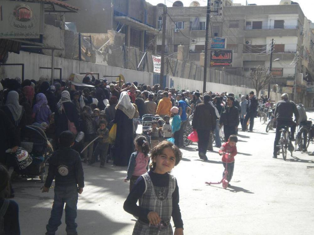 انتظار أهالي مخيم اليرموك المحاصر للحصول على بعض الحساء