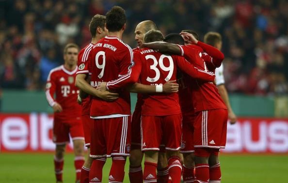 قطع فريق بايرن ميونيخ خطوة جديدة في طريق الحفاظ على ثلاثية الموسم الماضي، وتأهل لملاقاة بوروسيا دورتموند في نهائي كأس ألمانيا لكرة القدم عبر الفوز على ضيفه كايزر سلاوترن المنافس بدوري الدرجة الثانية بخمسة أهداف مقابل هدف واحد مساء الأربعاء في المربع الذهبي للبطولة. وتوج بايرن ميونيخ في الموسم الماضي بثلاثية الدوري، والكأس، بجانب لقب دوري أبطال أوروبا، ونجح الفريق حتى الآن في الفوز بلقب "البوندسليجا"، وتأهل لملاقاة ريال مدريد الاسباني في المربع الذهبي لدوري الأبطال، بينما تتبقى للفريق خطوة واحدة على إحراز لقب كأس ألمانيا حينما يلاقي دورتموند في نهائي البطولة يوم 17 مايو المقبل ببرلين. وأنهى البايرن شوط المباراة الأول متقدماً بهدفين نظيفين حملا توقيع باستيان شفاينشتايجر، وتوني كروس في الدقيقتين 23، و32 على التوالي. وبعد مضي خمس دقائق فقط من بداية الشوط الثاني حصل النادي البافاري على ضربة جزاء سجل منها توماس مولر الهدف الثالث للفريق، وتكفل سيمون زولر بتسجيل هدف حفظ ماء الوجه لكايزر سلاوترن في الدقيقة 60. وقبل 12 دقيقة من نهاية المباراة وضع المهاجم الكرواتي الدولي ماريو ماندزوكيتش بصمته على المباراة بتسجيله الهدف الرابع لبايرن ميونيخ، وفي الوقت بدل الضائع من المباراة أحرز ماريو جوتزه الهدف الخامس لبايرن. ولم يفز بايرن بأي مباريات في مسابقة الدوري الألماني (بوندسليجا) منذ أن حسم لقب المسابقة لمصلحته في وقت قياسي الشهر الماضي، كما أنه مني بهزيمة ساحقة بثلاثية نظيفة على ملعبه أمام خصمه اللدود بوروسيا دورتموند في أخر مبارياته بمسابقة الدوري يوم السبت الماضي، وستكون هذه ثالث مواجهة حاسمة بين بايرن ودورتموند خلال السنوات الثلاث الأخيرة. وكان دورتموند تغلب على البايرن بخماسية مقابل هدفين في نهائي كأس ألمانيا عام 2012 ليجمع بين لقبي الدوري والكأس المحليين، وبعدها تغلب البايرن على دورتموند في نهائي دوري أبطال أوروبا عام 2013.