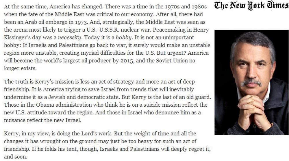 قال الكاتب الصحفي "توماس فريدمان" إن تحقيق السلام في الشرق الأوسط بالنسبة للولايات المتحدة كان ذا أهمية كبيرة سابقًا أما اليوم فهو "مجرد هواية". وأوضح في مقالٍ له الثلاثاء في صحيفة "نيو يورك تايمز" الأمريكية أن الشرق الاوسط لم يعد يتمتع بأهميته الاستراتيجية بالنسبة للولايات المتحدة بعد استقلال الأخيرة في مجال الطاقة، مشيرًا إلى أن "السلام في عهد وزير الخارجية الأميركي الأسبق هنري كيسنجر كان ضرورة أميركية إلا أنه الآن أصبح مجرد هواية". وقال فريدمان: هناك شعور متزايد باليأس في أوساط الإدارة الأميركية من نجاح المساعي لتحقيق التسوية بين الفلسطينيين والإسرائيليين على الرغم من استئناف المفاوضات. وأشار إلى أن الأيام الأخيرة شهدت تصعيدًا في مطالبة الأوساط الإعلامية الأميركية للرئيس باراك أوباما بسحب يد الولايات المتحدة من المفاوضات، معبرين عن شعور متزايد باليأس من إمكانية النجاح وأن مهمة كيري تتلخص في إنقاذ "إسرائيل" من أي تقويض يفضي إلى عدم الاعتراف بها كدولة يهودية. ولفت إلى أن وزير الخارجية الأمريكي جون كيري يبذل جهدًا كبيرًا في هذا الاتجاه، ولكن "في حال قام كيري بفك خيمة التفاوض فإن الاسرائيليين والفلسطينيين سيأسفون أسفًا عميقًا على ذلك". وأوضح فريدمان المقرب من الإدارة الأميركية أن البيت الأبيض أصبح لا يتمتع برغبة كبيرة للاستمرار في المفاوضات بآلياتها الحالية "ففي الوقت الذي تتجه فيه إسرائيل إلى اليمين وإلى التزمت الديني، نجد أن الجيل الشاب من الفلسطينيين أيضاً غير راغب بحل الدولتين".