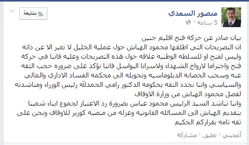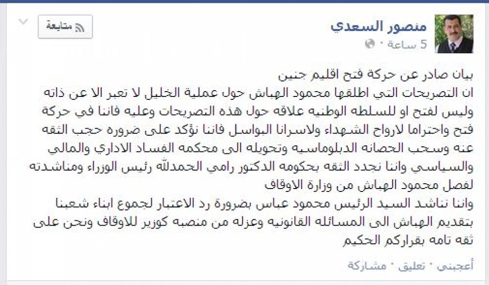 استنكر الناطق الإعلامي باسم حركة فتح في إقليم جنين منصور السعدي التصريحات التي صدرت عن وزير أوقاف رام الله محمود الهباش والتي استنكر فيها عملية الخليل والتي أسفرت عن مقتل ضابط إسرائيلي كبير وإصابة مستوطنين آخرين، مطالبًا بإقالته ومحاكمته. وقال السعدي في تصريح له على موقعه على شبكة التواصل الاجتماعي "فيس بوك" السبت: إن "التصريحات التي أطلقها محمود الهباش حول عملية الخليل لا تعبر إلا عن ذاته وليس لفتح أو للسلطه الوطنية علاقة حول هذه التصريحات". وأضاف "إننا في حركة فتح واحترامًا لأرواح الشهداء ولأسرانا البواسل فإننا نؤكد على ضرورة حجب الثقة عنه (الهباش) وسحب الحصانة الدبلوماسية". وطالب السعدي الرئيس محمود عباس بتحويل الهباش إلى محكمة الفساد الإداري والمالي والسياسي نتيجة تصريحاته ونتيجة ملفات سابقة تثبت تورطه بقضايا فساد. وأكد السعدي ثقة حركة فتح بحكومة الدكتور رامي الحمد لله رئيس الوزراء وناشده العمل على فصل الهباش من وزارة الأوقاف. كما ناشد الرئيس عباس بضرورة رد الاعتبار لجموع أبناء الشعب الفلسطيني بتقديم الهباش إلى المسائلة القانونية وعزله من منصبه كوزير للأوقاف، مضيفًا "نحن على ثقة تامة بقراركم الحكيم"، على حد قوله. يذكر أن العلاقة بين الهباش وحركة فتح تشهد توترًا منذ أكثر من عام وحاولت حركة فتح التخلص منه في أكثر من مناسبة ولكن إصرار الرئيس عباس على التمسك به حال دون ذلك. كما كاد الهباش أن يطيح بحكومة الحمد الله حين أصر الحمد الله على استبعاده من الحكومة ولكنه تراجع عن ذلك تحت ضغط الرئيس.