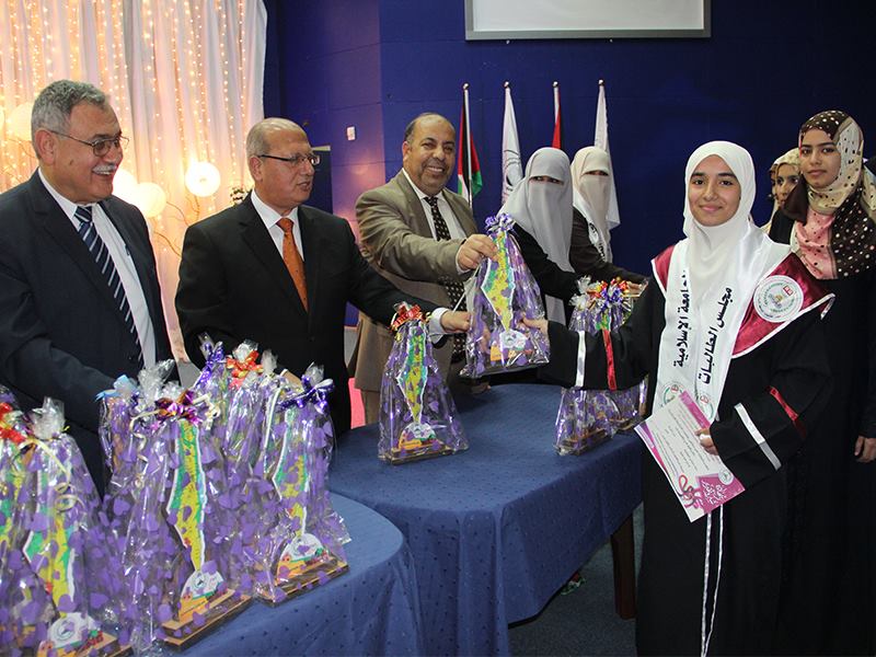 كرم مجلس طالبات الجامعة الإسلامية في غزة السبت850 طالبة متفوقة في الفصل الدراسي الأول. وقال رئيس مجلس الأمناء بالجامعة جمال الخضري إن الصرح العلمي الذي سيبقى متميزاً ورائداً بتميز وعطاء أبنائه الطلبة. وأضاف " نقف اليوم لنكرم فخر الجامعة وعزتها طالبتانا اللواتي قهرن الحصار الظالم وانتصرن عليه وثابرن وتميزن وأبدعهن فحق لنا اليوم أن نكرمهنَّ". وثمن الخضري جهود مجلس الطالبات وسعيهنَّ من أجل خدمة الطالبات ورعاية مصالحهن. ودعا الطالبات لأن يكون لكل واحدة منهنَّ هدف واضح تسير عليه لترتقي بنفسها وشخصيتها ومستواها العلمي والعملي وتقهر الظروف وتتخطى الصعاب. من جهته، قال رئيس الجامعة كمالين شعث: إن التظاهرة الفنية تؤكد على المعاني الكريمة التي تمثلونها بهذا التفوق ومنها تكريم العلم والعلماء، والتفوق والمتفوقات والمخلصات في علمهنّ وعطائهنَّ. وتخلل الاحتفال العديد من الفقرات الفنية التي تنوعت بين النشيد والاستعراض الفني لزهرات روضة براعم القدس والدبكة الشعبية لأشبال الروضة، والقصائد الشعرية والاوبريت الفني عن الحصار والتميز العلمي، وختم بتكريم المتفوقات.