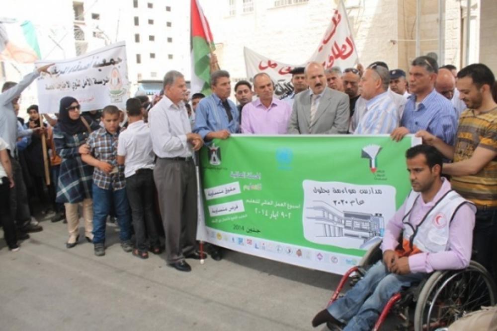 اعتصم ذوو الإعاقة وفعاليات جنين اليوم الأربعاء أمام مقر التربية والتعليم في جنين للمطالبة بتطبيق حقهم في التعليم في إطار فعاليات الحملة العالمية للتعليم والتي يشرف عليها الائتلاف التربوي الفلسطيني. ورفع المشاركون الشعارات واليافطات التي تدعو إلى مناصرتهم وإشراكهم في تحمل المسؤولية لكي يكونوا فاعلين في المجتمع. وأكد منسق الائتلاف عبد الله جرار في كلمته أن هذا الحراك ليس احتجاجًا وإنما من أجل كسب المناصرة والدعم والتأييد لذوي الإعاقة بهدف إشراكهم في المسؤولية، ومن أجل المطالبة بتشغيلهم، والحصول على حقوقهم التعليمية الكاملة دون منّة من أحد. ودعا الجهات المختصة للعمل على إقرار مخصصات كافية من موازنات المؤسسات الأكاديمية والأهلية لتحقيق المواءمة، وتبني إقرار سياسة الدمج والتعليم الجامع في المؤسسات التربوية، والعمل على إعداد خطة تأهيل للمعلمين المعنيين بتعليم الأشخاص ذوي الإعاقة، وتوفير الاحتياجات والأدوات اللازمة لهم. وسلّم المعتصمون مذكرة بمطالبهم إلى مديرة التربية والتعليم في جنين سلام الطاهر، لنقلها إلى وزير التربية والتعليم.