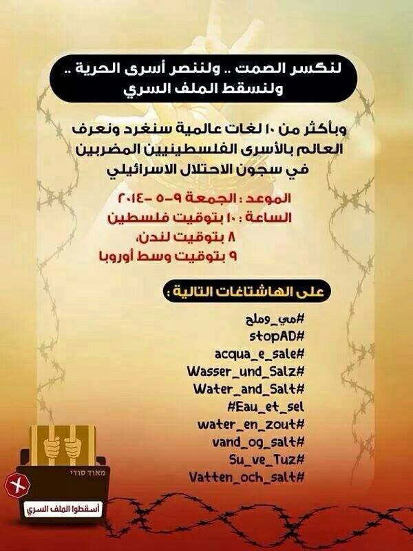 يطلق نشطاء ليل الجمعة حملة دولية بعنوان "مي وملح" بلغات دولية تضامنا مع الأسرى الفلسطينيين المعتقلين إداريا في سجون الاحتلال الإسرائيلي والذين يخوضون إضرابا مفتوحا عن الطعام لليوم الـ16 على التوالي. وستكون هذه الحملة التي ستكون على مواقع التواصل الاجتماعي بـ14 لغة مختلفة والتي تهدف لإبراز معاناة هؤلاء الأسرى، وحشد الدعم الدولي لهم ولقضيتهم وتشكيل ضغط دولي على الاحتلال الإسرائيلي للاستجابة لمطالبهم. ويواصل ما يزيد عن 140 أسيرًا إداريًا إضرابهم المفتوح عن الطعام منذ 16 يومًا على التواصل بغرض كسر سياسة الاعتقال الإداري التي تنتهجها سلطات الاحتلال الإسرائيلي بحقهم.