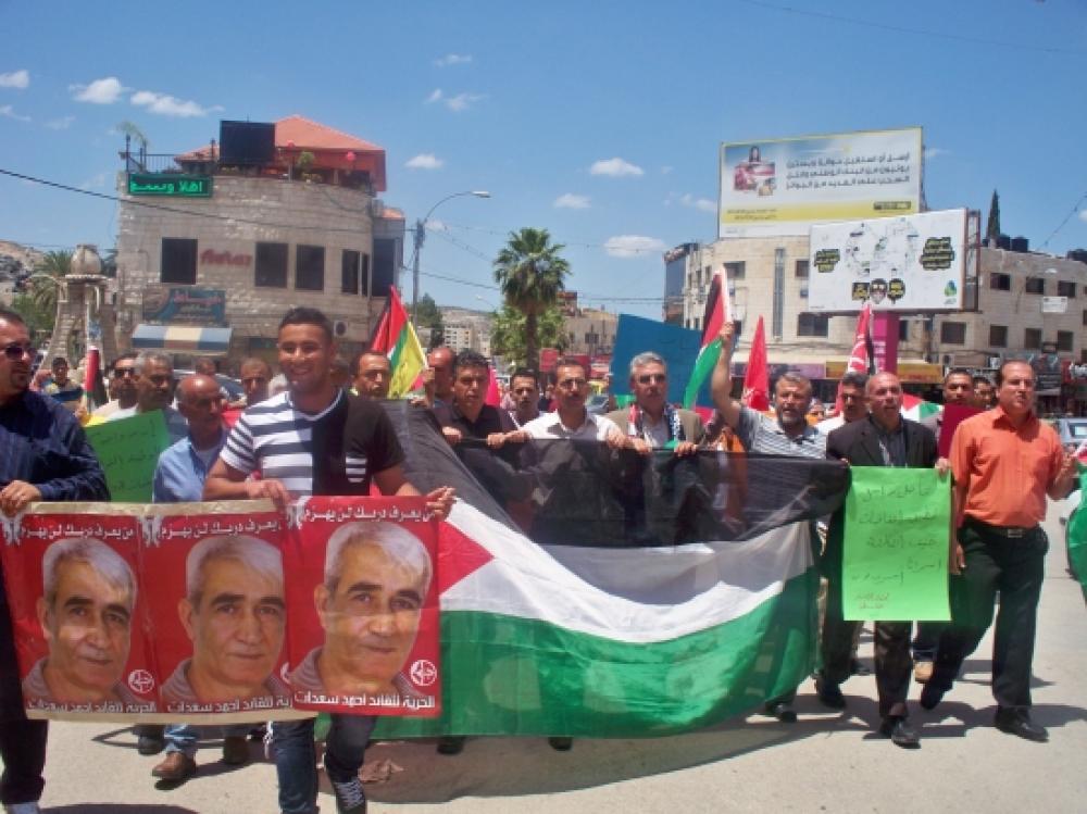 نظمت فعاليات جنين السبت وقفة تضامنية مع الأسرى الإداريين المضربين عن الطعام أكدت على دعم إضراب الأسرى وضرورة إنهاء ملف الاعتقال الإداري. وردد المشاركون هتافات تطالب المجتمع الدولي بالضغط على حكومة الاحتلال من أجل وقف الانتهاكات التعسفية بحقهم واستمرار اعتقالهم. وناشد مدير نادي الأسير في جنين راغب أبو دياك أبناء المحافظة إلى تكثيف حملة التضامن مع الأسرى المضربين عن الطعام لليوم السابع عشر على التوالي، رفضا لسياسة الاعتقال الإداري الجائر بحقهم في ظل تراجع وضعهم الصحي. ودعا النائب في المجلس التشريعي خالد سعيد جماهير الشعب الفلسطيني إلى الالتفاف حول قضية الأسرى في ظل وضع أحوج ما يكونون للوقوف معهم، خاصة بأنهم قدموا الكثير لنا كي نحيا بكرامة على أرض محررة من دنس الاحتلال. وحمل منسق فصائل العمل الوطني والإسلامي عطا غباريه حكومة الاحتلال المسؤولية عن حياة الأسرى في ظل تعنت حكومة الاحتلال الإسرائيلي بالاستجابة لمطالبهم العادلة.