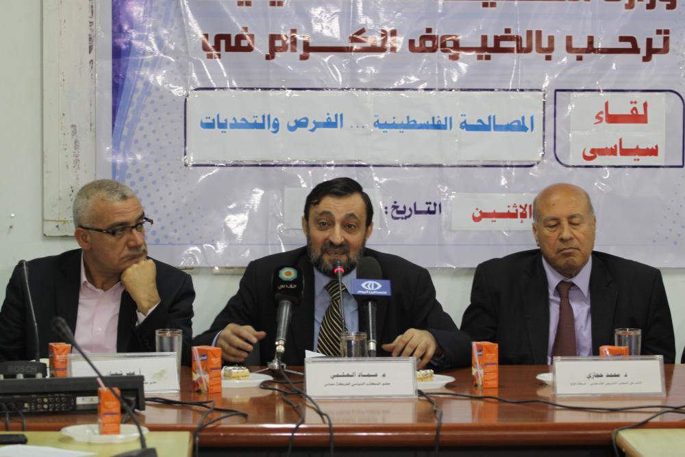 أكد متحدثون في لقاء سياسي بغزة أن إعلان المصالحة الأخير بين حركتي فتح وحماس فرصة تاريخية ووطنية لبناء نظام سياسي وطني قادر على مواجهة كافة الضغوطات والتحديات التي تعصف بالقضية الفلسطينية. وقال هؤلاء في اللقاء الذي نظمته وزارة التخطيط بغزة بعنوان "المصالحة الفلسطينية الفرص والتحديات" إن دور حكومة الوفاق التي يتم تشكيلها حاليًا مسيّر لأمور غزة والضفة لحين إجراء الانتخابات، وإن الحل الجذري للمشاكل الأساسية التي سببها الانقسام سيكون على عاتق الحكومة التي ستشكل فيما بعد هذه الانتخابات. وأكد عضو المكتب السياسي لحركة حماس عماد العلمي أن حركته اتخذت قرارًا نهائيًا بإنهاء الانقسام وتحقيق المصالحة ولا رجعة فيه، مشددًا على ضرورة عدم الحديث عن تحديات وإنما ضغوطات سيتمكن الطرفان من التغلب عليها. وقال إن إنجاز كافة ملفات المصالحة رزمة واحدة- وهو مطلب الحركة- هو الكفيل بفصل كافة المشاكل التي تسببت بالانقسام، وعلى رأسها النظام السياسي والمصالحة المجتمعية والأجهزة الأمنية والانتخابات. وشدد على أن الالتفاف الشعبي حول هذا الإعلان وضرورة إنهاء الانقسام هو الأهم في هذه المرحلة، داعيًا لتوحد كافة القوى والفصائل في جسم واحد من أجل مواجهة الاحتلال والتحديات. واعتبر أنه ومن أجل إنهاء هذا الانقسام بلا رجعة لا بد من بناء النظام السياسي الفلسطيني على أسس وطنية مشتركة تضمن دخول حركتي حماس والجهاد في منظمة التحرير بعد إعادة بنائها. كما شدد على ضرورة بناء الثقة بين حركته وفتح وثقة الشعب بكليهما، مؤكدًا أن إنهاء الانقسام النفسي الذي تسبب بهدر الدم بين أبناء الحركتين أمر مهم يجب إنهاؤه قبل الانقسام الجغرافي الذي أوجده الاحتلال أصلاً إضافة للأمان الوظيفي والحريات والحقوق. وطالب بالحفاظ على إنجازات المقاومة الفلسطينية وحمايتها، منوهًا إلى أن أهم ما حققته غزة في المرحلة الماضية هو إيجاد معادلة وجود سلطة ومقاومة. [title]التحدي المالي والوظيفي[/title] من جانبه، قال النائب عن كتلة فتح البرلمانية في المجلس التشريعي محمد حجازي إن حركته ستناضل بكل قواها من أجل إنجاز المصالحة ولن تتطلع إلى الوراء. وأضاف أن حكومة الوفاق الوطني التي سترى النور خلال مايو الجاري ستكون لتسيير الأوضاع اليومية لغزة والضفة لحين إجراء انتخابات فيهما وفي القدس، إضافة لأهمية دراسة حق الانتخاب للفلسطينيين في الشتات. وأشار إلى أن هذه الحكومة لن يكون لها أي شأن أو موقف من المفاوضات كما لا علاقة لحركتي فتح وحماس بها، موضحًا أن المفاوضات من شأن منظمة التحرير وأنه ليس المهم مع أو ضد وإنما ما ينتج عن هذه المفاوضات. واعتبر أن التحدي الأكبر أمام إنجاز المصالحة هو التغلب على التهديد المالي والوظيفي، منوهًا إلى أن الدول العربية وعدت بأن تقوم بدورها في تعويض السلطة في حال تم قطع الأموال عنها من أي طرف خارجي. بدوره، أكد وزير التخطيط بغزة علاء الرفاتي أن أبناء الشعب الفلسطيني يعولون على إعلان المصالحة الأخير أمالًا كثيرة، معتبرًا أن هذا الاتفاق يختلف عما سبقه باعتبار أنه تم على أرض فلسطين وبدون أي وسيط. وأوضح أن التركيز على ضرورة تنفيذ الملفات التي تم الاتفاق عليها هو الجديد فيه وعلى رأسها الانتخابات وتشكيل الحكومة والمصالحة المجتمعية. وقال "إن ملف الأجهزة الأمنية قيد الدراسة حتى يتم الوصول إلى أجهزة أمنية وطنية تساهم في بناء الأمن الفلسطيني". [title]وفق ثوابت الشعب[/title] بدوره، أكد مساعد وكيل وزارة الخارجية الأسبق محمود العجرمي أن أي وحدة فلسطينية يجب أن تبنى على أسس وطنية ثابتة تحقق الأهداف الوطنية. وأشار إلى أن هناك بعدين دولي وعربي تسببا بحالة الانقسام الذي شهدته فلسطين ليس منذ عام 2007 وإنما منذ عام 1993، مبيّنًا أن هذه الأطراف كنات تدعم هذا الانقسام لأنه يخدم مصالحها. واعتبر أن اعتراف السلطة الفلسطينية بـ"إسرائيل" هو أكبر خطأ في تاريخ القضية، وأنه تسبب بتأكل حقيقي للقرارات الدولية التي أكدت على القدس وحق عودة اللاجئين وعدم ا
