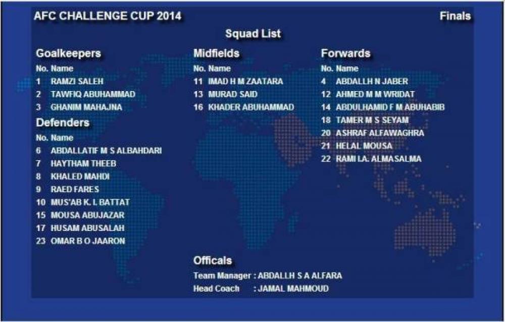 كشف النقاب رسمياً الأربعاء عن قائمة المنتخب الوطني الفلسطيني لكرة القدم المشاركة في بطولة كأس التحدي الأسيوي المقرر انطلاقها يوم 19 مايو الجاري في جزر المالديف، وتؤهل الفائز بلقبها لنهائيات كأس أسيا 2015 بأستراليا. وتتكون التشكيلة من رمزي صالح, وتوفيق علي, وغانم محاجنة في حراسة المرمى، وفي خط الدفاع: عبد الله جابر، وموسى أبو جزر، وهيثم ديب، وعبد السلام السويركي، وخالد مهدي، ورائد فارس، ومصعب البطاط، وعبد اللطيف البهداري، وعمر جعرون. أما في خط الوسط فيتواجد حسام أبو صالح، وأحمد ماهر، وخضر يوسف، وفايز عسيلة، ومراد إسماعيل، وهلال موسى، وبالهجوم: تامر صيام، ورامي مسالمة، وعبد الحميد أبو حبيب، وأشرف نعمان، وعماد زعترة. يشار إلى أن بعثة "الفدائي" تغادر الوطن إلى جزر المالديف يوم الجمعة المقبل عبر مطار الملكة علياء الأردني متجهة لجزر المالديف مباشرة.