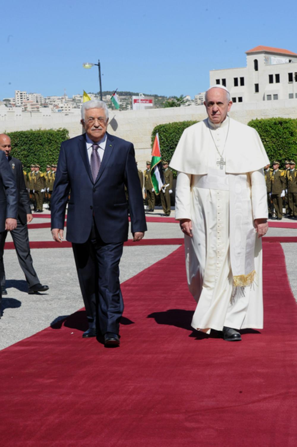 استقبل الرئيس محمود عباس صباح الأحد بابا الفاتيكان فرانسيس الأول في مدينة بيت لحم جنوب الضفة الغربية، في زيارة تاريخية لدولة فلسطين. ورحب عباس في مؤتمر مشترك مع البابا فرانسيس بالزيارة، وقال إنه شرف كبير أن يتم استقباله في مدينة بيت لحم مهد المسيح عليه السلام. وقال :" إن الأرض المقدسة التي ترحب بكم في ربوعها لتعتز بمسيحييها ومسلميها بزيارتكم والتي لها معان سامية بنفوس شعبنا". وشدد عباس أنه يعول على جهوده ومساعيه الخيرة لإحقاق حقوق الشعب الفلسطيني، معرباً عن ترحيبه بأي مبادرة تصدر عنه تجعل السلام حقيقة في الأرض المقدسة، وبما يمكن شعبنا من بناء حياته ومستقبله الانساني والثقافي وهويته الحضاري بأمن وسلام. وقال : " قد أحطنا قداسته علما بمآلات العملية التفاوضية والعثرات والعراقيل التي تعترض سبيلها وعلى رأسه الاستيطان وكذلك الاستمرار في معاناة آلاف الأسرى الفلسطينيين الذي يخوض عدد كبير منهم اضرابا مفتوحا عن الطعام " . وبين أنه أطلع البابا على الوضع المأساوي الذي تعيشه مدينة القدس من عمل اسرائيلي ممنهج لتغيير هويتها وطابعها، والتضييق على أهلها المسيحيين والمسلمين بهدف تهجيرهم ومنع المؤمنين من خارجها من الصلاة فيها. ودعا "إسرائيل" لوقف الاعمال التي تخالف القانون الدولي، مشيراً إلى أن فلسطين قدمت رؤيتها لعاصمتها "القدس الشرقية" وهي أن تبقى مفتوحة لأتباع الديانات الثلاث دون تمييز. وأبدى استعداده لتعزيز الوجود المسيحي الأصيل في الأرض المقدسة، مثمناَ جهود البابا في دعم حقوق الشعب الفلسطيني، وأضاف " نعول على قداستكم من مكانة مسيحية قدسية للعمل على تمكين شعبنا من نيل حريته واستقلاله واقامة الدولة وعاصمتها القدس". وتحدث عباس عن جدار الفصل العنصري الذي وصفه بـ"البغيض" الذي تقيمه "إسرائيل" على الأراضي الفلسطينية " في الوقت الأحوج فيه لبناء أصول التواصل والجوار الحسن والبعد عن كل ما من شأنه أن يزرع بذور الكراهية، ونتطلع بالعيش بحرية وكرامة وسيادة على ترابه الوطني بعيداً عن حراب الاحتلال". وأضاف " لا نطلب المستحيل، وقدمنا تضحيات جسام من أجل السلام، وقبلنا بإقامة الدولة على 67 فقط وعاصمتها القدس الشرقية كأرض محتلة إلى جانب دولة اسرائيل بأمن واستقرار وسلام"، مجدداً التزامه بالمبادرة العربية للسلام. وشكر عباس البابا على لقائه أطفال مخيمات اللاجئين، مقدراً رغبته مشاركة طاولة الغداء مع عائلات فلسطينية تمثل شرائح المجتمع. وشدد على أن الأمن والاستقرار والسلام مصلحة للشعبين الفلسطيني والإسرائيلي، وأن السلام يصنع بتحكيم القلب والعقل والضمير الإنساني ورفع الظلم وسياسة المعايير المزدوجة والكيل بمكيالين. بدوره، أكد البابا فرانسيس أنه حان الوقت لإنهاء معاناة الفلسطينيين وتشجيع السلام وحل الدولتين. وقال في كلمته خلال المؤتمر : " يجب مضاعفة الجهد والمبادرات، وحان الوقت الاعتراف من قبل الجميع بالحق في دولتين تتمتع بالأمن والسلام ضمن". وأكد أن السلام يجلب معه السعادة للمنطقة، معرباً عن أمله أن يتمكن الشعب الفلسطيني و الاسرئيلي وقيادتهما بالتوصل إلى السلام وتتطور العلاقة بينهما لصالح الطرفين. وقدر جهود الرئيس عباس في تعايش الأديان بسلام.