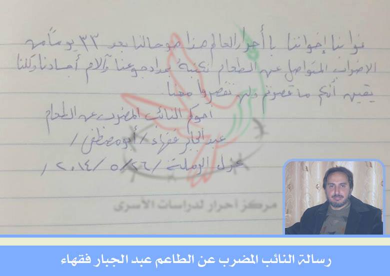 وجه النائب في المجلس التشريعي والمضرب عن الطعام عبد الجابر فقهاء رسالة لنواب الشرعية الفلسطينية ونواب العالم أن "أغيثونا قبل فوات الأوان فوضعنا جد خطير والموت يلاحقنا في كل دقيقة". وأضاف النائب فقهاء في الرسالة التي وصلت لمركز "أحرار" لحقوق الإنسان "يا نواب الشرعية الفلسطينية، يا من جربتم السجن والاعتقال وعانيتم لسنوات طويلة من نار البعد عن الأوطان والأهل والأحباب تحت سيف الاعتقال الإداري المسلط على رقاب خيرة أبناء الشعب وضعنا جد خطير". وتابع قائلاً: "بتنا غير قادرين على الوقوف ونصلي ونحن جلوس، ومنذ ما يزيد عن ال10 أيام لم ندخل المرحاض وباتت معدتنا تخرج أحماضا برائحة وطعم مقرف". وتحدث النائب في رسالته المؤلمة عما يشعر به هو ورفاقه المضربون قائلًا: "النوم خاصم جفوننا ونشعر بدوار شديد طوال الوقت، وهناك عدم وضوح بالرؤيا ونمنمة في أطراف اليد، بالإضافة لشعورنا بالبرد الشديد رغم حرارة الجو". وذكر النائب في رسالته للنواب في العالم وعموم الشعب الفلسطيني "ورغم كل ما نحن فيه من ضعف إلا أن مصلحة السجون الإسرائيلية تقوم بتفتيش غرفنا كل يوم وتنكل بنا بطريقتها من خلال إجراءات استفزازية تحت حجج واهية في محاولة منها لإضعافنا وإجبارنا على فك الإضراب". وأضاف النائب الذي يعتبر أحد قادة الإضراب وعضو لجنة الحوار للإضراب "ومع ذلك فما زالت معنوياتنا عالية وهممنا تناطح عنان السماء، لن نكل أو نمل، لن نقبل بأنصاف الحلول، ماضون في إضرابنا حتى نسقط هذا القانون الجائر". وذكر النائب أن تعتيما شديدا تفرضه مصلحة السجون على أخبار المضربين وما يحدث من حراك في الخارج "لكن أخبار خيمكم الصابرة ونشاطاتكم وفعاليات المؤسسات تصلنا من خلال رحلة البوسطة، فبورك فيكم ولكننا نحتاج المزيد المزيد فمعركتنا نخوضها نيابة عن جميع الأحرار في العالم". واختتم النائب فقهاء رسالته "لن نخذل ابناء الشعب الذين اختارونا لنمثلهم فها نحن ندافع عن حقوقهم ونحن داخل سجون وزنازين الاحتلال ليس بصوتنا ولكن بأمعائنا الخاوية وإيماننا بحقنا المقدس في الحرية والتحرر".