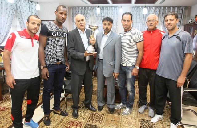 رئيس اتحاد القدم جبريل الرجوب يستلم كأس بطولة التحدي من عناصر المنتخب الوطني