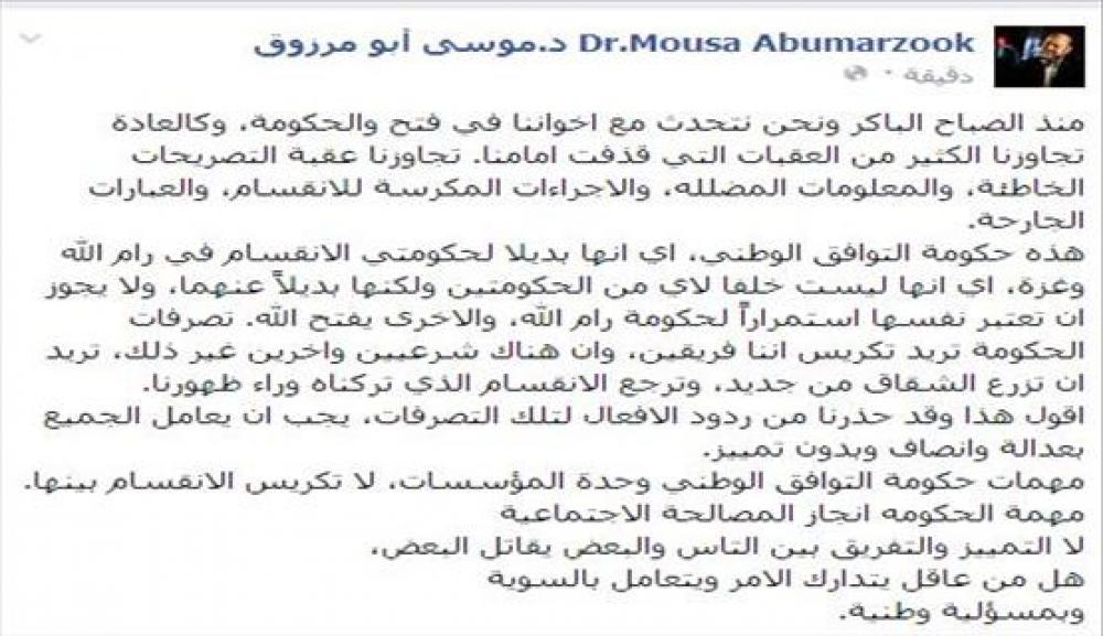 أبو مرزوق:على حكومة التوافق أن تتعامل بعدالة ودون تمييز