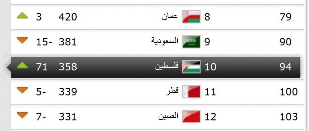 قفز المنتخب الوطني الفلسطيني لكرة القدم إلى المركز 94 عالمياً والعاشر عربياً, في التصنيف العالمي الذي أصدره الاتحاد الدولي لكرة القدم "الفيفا" الخميس. وكان "الوطني" يحتل المركز 165 عالمياً الشهر الماضي, إلا أنه قفز 71 مركزاً دفعة واحدة بعد إحرازه كأس التحدي الآسيوي مؤخراً وأصبح في المركز 94 رافعاً رصيده إلى 358 نقطة في التصنيف العالمي. وعلى صعيد المنتخبات العالمية, واصلت إسبانيا تصدرها للتصنيف, تليها ألمانيا, في حين أصبحت البرازيل ثالثة, تاركة المركز الرابع للبرتغال. وجاء المنتخب الأرجنتيني في المركز الخامس, ثم سويسرا, وأوروجواي, وحلّت كولمبيا في المركز الثامن, متفوقة على إيطاليا، وإنجلترا على التوالي. وفيما يتعلق بالمنتخبات العربية, تصدر المنتخب الجزائري القائمة في المركز 22 عالمياً, يليه مصر (36), وتونس (48), والأردن (63), وليبيا (64), والإمارات (72), والمغرب (77), وعُمان (79), والسعودية (90), وفلسطين (94). يشار إلى أن المنتخب الوطني فاز قبل أسبوع بلقب بطولة كأس التحدي بعد تجاوزه الفلبين في النهائي بهدف نظيف، ليضمن التأهل لنهائيات أمم أسيا 2015 في أستراليا.