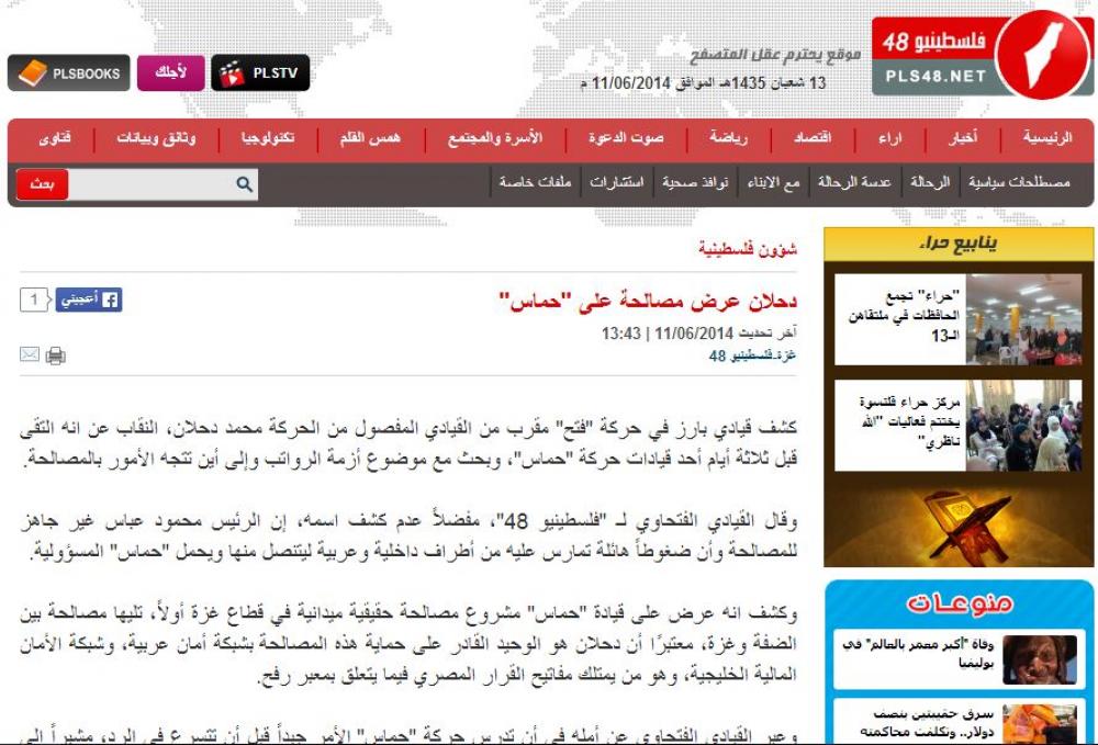 كشف قيادي بارز في حركة التحرير الوطني الفلسطيني (فتح) مقرب من القيادي المفصول من الحركة محمد دحلان النقاب عن أنه التقى قبل ثلاثة أيام أحد قادة حركة حماس وبحث معهم موضوع أزمة رواتب موظفي حكومة غزة السابقة، وإلى أين تتجه أمور المصالحة. ونقل موقع "فلسطينيو 48" عن هذا القيادي قوله الأربعاء: إن "الرئيس محمود عباس غير جاهز للمصالحة وأن ضغوطًا هائلة تمارس عليه من أطراف داخلية وعربية ليتنصل منها ويحمل حماس المسؤولية". وكشف أنه عرض على قيادة حماس مشروع مصالحة حقيقية ميدانية في قطاع غزة أولاً تليها "مصالحة بين الضفة وغزة"، معتبرًا أن دحلان هو "الوحيد القادر على حماية هذه المصالحة بشبكة أمان عربية، وشبكة الأمان المالية الخليجية، وهو من يمتلك مفاتيح القرار المصري فيما يتعلق بمعبر رفح". وعبر القيادي الفتحاوي عن أمله في أن تدرس حركة حماس الأمر جيدًا "قبل أن تتسرع في الرد"، مشيرًا إلى أن حماس وعدت بالفعل بدراسة الأمر في ضوء شعورها بـ"تلاعب عباس ونكوصه عن المصالحة". وأشار الموقع إلى أن شخصيات من حماس التقت العام الماضي دحلان ومجموعة من القيادات التابعة له في دولة الامارات، وشكلوا هيئة خيرية أطلقوا عليها "الجمعية الوطنية للتكافل والتنمية الاجتماعية" هدفها العمل على التقريب بين الطرفين من خلال قضايا انسانية الأمر الذي استفز عباس في حينه واعتبره "لعبًا من وراء ظهره". وكان عباس فصل دحلان من عضوية اللجنة المركزية لحركة فتح، تبعها اجراءات بالفصل وقطع الرواتب طاول المئات من أنصار دحلان خصوصًا في قطاع غزة. وتوصل عباس و"حماس" إلى اتفاق مصالحة في 23 أبريل الماضي تمخضت عنه حكومة توافق وطني كانت رواتب حكومة غزة السابقة أول العقبات التي اعترضتها بصرفها رواتب موظفي حكومة رام الله السابقة، وحرمان موظفي حكومة غزة السابقة.