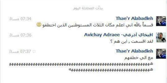 سخر شبان فلسطينيون على موقع التواصل الاجتماعي فيسبوك من المتحدث بلسان الجيش الإسرائيلي للإعلام العربي افيخاي أدرعي حول اختفاء آثار ثلاثة مستوطنين إسرائيليين منذ أربعة أيام في الضفة الغربية المحتلة في ظروف لا تزال غامضة. وراسل هؤلاء أدرعي عبر صفحته الرسمية على الموقع، مدعين نيتهم تقديم معلومات عن عملية الخليل أو مكان وجود المستوطنين الثلاثة المفقودين، ليتضح أنها محاولة للنيل والسخرية منه. وجاء في إحدى المحادثات: "أنا بعرف أهل الخليل كيف اطلعوا المستوطنين من دون علمكم، فرد أدرعي: بصدق! كيف ومتى، فقال الشاب: عن طريق قناين جر المي بمساعدة أبو النار وأبو الحكم" في إشارة إلى مسلسل "باب الحارة" السوري الذي اسُتخدمت فيه الانفاق لإدخال المساعدات للحارة المحاصرة من قبل الجيش الفرنسي. وتظهر محادثة أخرى محاولة ادرعي التقاط أية تفاصيل عن العملية، : "قسما بالله أني بعرف مكان المستوطنين الثلاثة المختطفين، فسأله أدرعي: لقد اقسمت أين هم؟ فأجابه: مع اللي خطفهم هههـ". ويحظى أدرعي على موقع فيس بوك بنحو 376 ألف متابع وتويتر قرابة 93 ألف متابع، جلهم من الوطن العربي. الأمر الذي يحذر منه مختصون أمنيون من ناحية الاسقاط أو الاستفادة من المعلومات. وتصف المخابرات الإسرائيلية شبكات التواصل الاجتماعي بـ"الكنز الكبير"، لحصولها على معلومات هامة ودقيقة منها، وتعدها جاسوسًا كبيرًا تزرعه، دون أن يلقى القبض عليه، ويعطيها معلومات وقتية وبشكل أسرع، مما أن يتخيله أحد. وتتابع وحدات إسرائيلية متخصصة هذه المواقع وتحلل المعلومات الأمنية الواردة منها، ويمر ذلك بثلاث مراحل، هي تنقية وتحقيق واستدلال، للتأكد من صحتها كمعلومة مخابراتية بواسطة الوسائل السرية، ثم نقلها بعد ذلك للمسؤولين، عدا عن مراقبة المحادثات وتتبع الشخصيات المؤثرة. وكان قائد وحدة "حتسف" الإسرائيلية المتخصصة في مراقبة شبكات التواصل قال مؤخرًا: "كل كلمة تكتب، أو صورة ترفع على فيسبوك تحت أعيننا، ونولى لها اهتمامًا كبيرًا، ثم نحللها وتستنتج الصحيح منها، نحن لا نرفض شيء يكتب لأنها في النهاية ستؤدى إلى معلومة خطيرة". وكثفت الأجهزة الأمنية الإسرائيلية من عملياتها الحثيثة بحثًا عن ثلاثة مستوطنين اختفت آثارهم منذ أربعة أيام قرب مستوطنة "كفار عتصيون" جنوب غرب بيت لحم جنوب الضفة الغربية المحتلة.