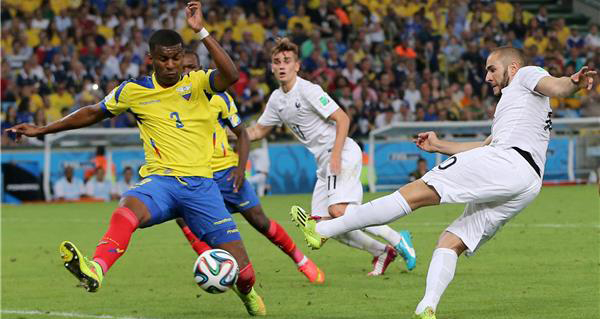 احتكم منتخبا فرنسا والإكوادور للتعادل السلبي في المباراة التي جرت على ملعب "ماراكانا" مساء الأربعاء, ضمن منافسات الجولة الثالثة من المجموعة الخامسة لمونديال البرازيل 2014. وجاءت المباراة مثيرة في مجرياتها, وأتيحت عدة فرص محققة للتسجيل من جانب الطرفين, إلا أن المهاجمين فشلوا بإحراز أي هدف, علماً أن الإكوادور أكملت المباراة بعشرة لاعبين بعد طرد لويس فالنسيا في الدقيقة 50. وبهذا التعادل رفعت فرنسا رصيدها إلى 7 نقاط في الصدارة, لتضرب موعداً في الدور الثاني مع نيجيريا, بينما بات رصيد الإكوادور 4 نقاط في المركز الثالث, وودّعت المونديال من الدور الأول. وفي مباراة أخرى لحساب نفس المجموعة، ضرب المنتخب السويسري موعداً في الدور الثاني مع نظيره الأرجنتيني "التانجو", إثر فوزه الساحق على هندوراس بثلاثية نظيفة على ملعب "أرينا دي أمازونيا". وفرض شيردان شاكيري نفسه نجماً للمباراة بإحرازه ثلاثية سويسرا في الدقائق السادسة, و31, و71 على التوالي. ورفع الفوز رصيد سويسرا إلى 6 نقاط في المركز الثاني, في حين ودّعت هندوراس المونديال دون نقاط في المركز الرابع والأخير.
