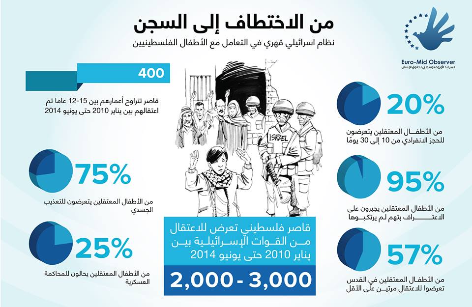 وثّق المرصد الأورومتوسطي لحقوق الإنسان، ومقره الرئيس جنيف، اعتقال قوات الاحتلال الإسرائيلي نحو ثلاثة آلاف طفل فلسطيني في الفترة منذ بداية العام 2010 حتى منتصف العام 2014، نسبة كبيرة منهم تتراوح أعمارهم بين اثني عشر عامًا إلى خمسة عشر عامًا فقط. وقال المرصد في تقرير أصدره حول الانتهاكات الإسرائيلية بحق الأطفال الفلسطينيين، في الوقت الذي تشهد فيه الضفة الغربية حملة واسعة لاقتحامات جيش الاحتلال الاسرائيلي لمنازل المواطنين واعتقالهم من داخل بيوتهم، إنه تم تضمين التقرير الحقوقي عشرات الشهادات الموثقة بالفيديو لأطفال اعتقلوا خلال الشهور الأولى من العام 2014، مشيرًا إلى أن 75 % من الأطفال الذين تحتجزهم السلطات الإسرائيلية يتعرضون للتعذيب الجسدي، ويقدَّم 25 % منهم إلى المحاكمة العسكرية. وداهمت قوات الجيش الإسرائيلي على مدى ثلاثة أسابيع أكثر من 1500 منزل فلسطيني ومحال تجارية، وقامت باعتقال أكثر من 600 فلسطيني. وذكر المستشار القانوني للمرصد الأورومتوسطي إحسان عادل أن "قوات شرطة وجيش الاحتلال تقوم باقتحام المنازل في منتصف الليل واعتقال الأطفال دون إخبارهم ما هي تهمتهم أو إبلاغ ذويهم، ولا تعاملهم بكرامة كما هو منصوص عليه بموجب اتفاقية جنيف الرابعة واتفاقية حقوق الطفل". وعرض التقرير بشكلٍ تفصيلي لمعاناة الأطفال المعتقلين والانتهاكات الإسرائيلية بحقهم، والتي تبدأ من اعتقال العديد منهم تعسفياً، أو على خلفية أعمال سلمية مشروعة وفق القانون الدولي، في مخالفة لاتفاقية حقوق الطفل - والتي كان الجانب الإسرائيلي قد صادق عليها عام 1991-، وتنص في مادتها (37/ ب)، على أن "لا يُحرم أي طفل من حريته بصورة غير قانونية أو تعسفية (..) ولا يُلجأ إلى اعتقاله أو سجنه وفقًا للقانون إلا كملجأ أخير ولأقصر فترة زمنية". وأكد التقرير أن اعتقال أطفال على خلفية مسيرات سلمية "ينضوي على انتهاك فاضح لحقهم في التعبير عن آرائهم". كما سرد التقرير مجموعة من الانتهاكات التي يمارسها الاحتلال بحق الأطفال خلال عملية الاعتقال بحد ذاتها، والكيفية التي يتم بها، "حيث يداهم الاحتلال في الغالب بيوت الأطفال بعد منتصف الليل وهم نيام، ويرافق تلك المداهمات عادةً مجموعة من الإجراءات التي تملأ الخوف في نفس الطفل وعائلته، دون مبرر واضح أو حاجة أمنية فعلية، مثل اقتحام بيت الطفل بأعداد كبيرة من الجنود بعد تفجير الباب والدخول على الطفل وهو نائم في سريره". وبيّن تقرير المرصد الأورومتوسطي لحقوق الإنسان تعرّض أغلب الأطفال المعتقلين لتهديد وتعذيب جسدي بالضرب خلال التحقيق، وتلجأ السلطات الإسرائيلية المسؤولة عن التحقيق إلى استخدام "أسلوب العزل" ضد واحد من كل خمسة أطفال تقوم باحتجازهم، كوسيلة للضغط على الطفل أثناء التحقيق، والذي قد يمتد من عشرة أيام في المتوسط ويصل إلى ثلاثين يوماً في بعض الحالات. وخلال فترة "العزل"، يوضح التقرير المتضمن شهادات حية، تقوم سلطات التحقيق بوضع الطفل وحيداً في "زنازين" ضيقة المساحة، ولا تسمح لأي أحد بمقابلته، بما في ذلك - في بعض الأحيان- محاميه، كما أن جدران الزنازين ملوَّنة باللون الرماديوتحتوي على نتوءات تجعل من الصعب على الطفل الاستناد إلى الحائط. ولفت المستشار إحسان عادل النظر إلى توافق بين نتائج دراسة المرصد الأورمتوسطي ونتائج دراسة لمنظمة الأمم المتحدة للطفولة "يونيسيف" أُجرِيَت في فبراير من العام 2013 والتي أوضحت أن "المعاملة السيئة للأطفال الذين يتعرضون لنظام الاحتجاز العسكري الإسرائيلي ظاهرة على نطاق واسع ومُمَنهَج ومُنَظّم خلال العملية". وتطرّق التقرير إلى الإجراءات المُنافية للقانون الدولي التي تسلكها السلطات الإسرائيلية باحتجاز الأطفال في سجون تقع داخل إسرائيل، مما يحرم ذويهم من إمكانية زيارتهم أو حضور محاكمتهم، إضافةً إلى حرمان الأطفال من حضور محاميهم خلال المحاكمة في بعض الأحيان، من خلال عقدها داخل إسرائيل وعدم منح المحاميين الترخيص اللازم للدخول إلى الأراضي الإسرائيلية. وخلًص الت