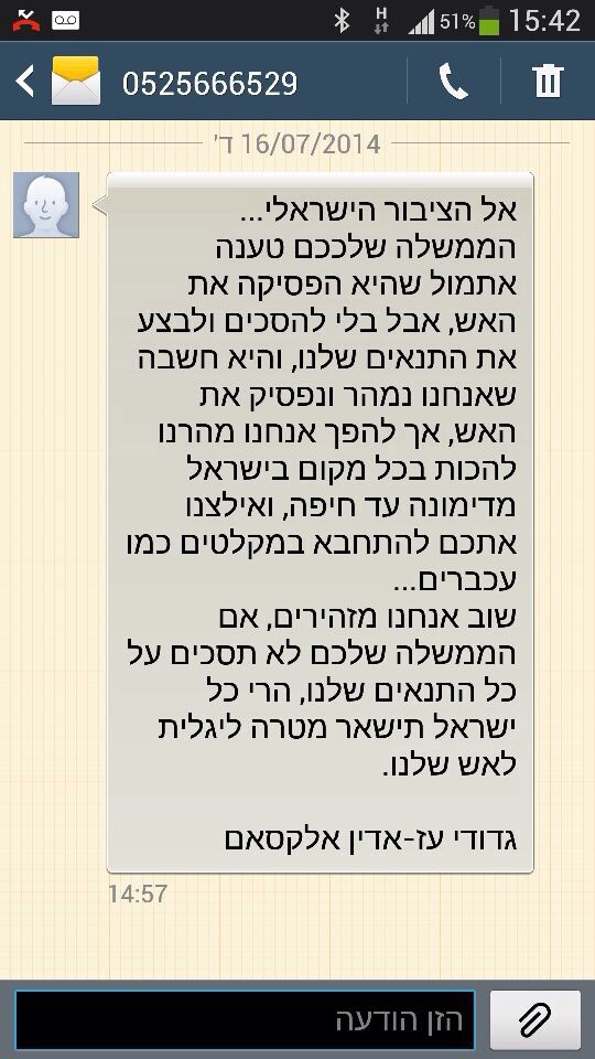 كشفت مصادر إعلامية عبرية عن قيام كتائب القسام ظهر الأربعاء بالسيطرة على نظام الرسائل الخاص بمجلس مستوطنات "بنيامين" المحيطة برام الله، وإرسال رسائل التهديد للإسرائيليين عبر هذا النظام. وجاء في نص إحدى الرسائل التي تلقاها مشتركو هذه الخدمة " إلى الجمهور الإسرائيلي : ادعت حكومتكم بالأمس أنها أوقفت إطلاق النار ولكن دون الموافقة على شروطنا وقد اعتقد بأننا سنسارع لوقف إطلاق النار ولكن ما حصل هو العكس". وجاء أيضاً " فقد سارعنا للضرب في كل مكان في إسرائيل من ديمونا وحتى حيفا وقد اختبأتم في الملاجئ كالجرذان، نحذر حكومتكم مجدداً من مغبة عدم الموافقة على شروطنا لان إسرائيل بأكملها ستبقى هدفاً مشروعاً لنيراننا ، كتائب عز الدين القسام". وفي أعقاب وصول هذه الرسائل للمستوطنين قام بعضهم بالرد عليها بالسباب والشتائم واتصلوا على مجلس المستوطنات وشتموهم ، حيث تبين للمجلس بعد فحص معمق أن كتائب القسام اخترقت نظام الرسائل وسيطرت عليه . وجاء في بيان نشره المجلس أن حماس سيطرت على نظام الرسائل، وأنه جرى وقف هذه الخدمة في أعقاب الاختراق، بينما يجري العمل على صد هذا الاختراق، بحسب ما أوردته القناة العبرية السابعة .