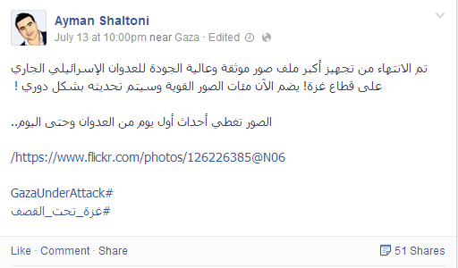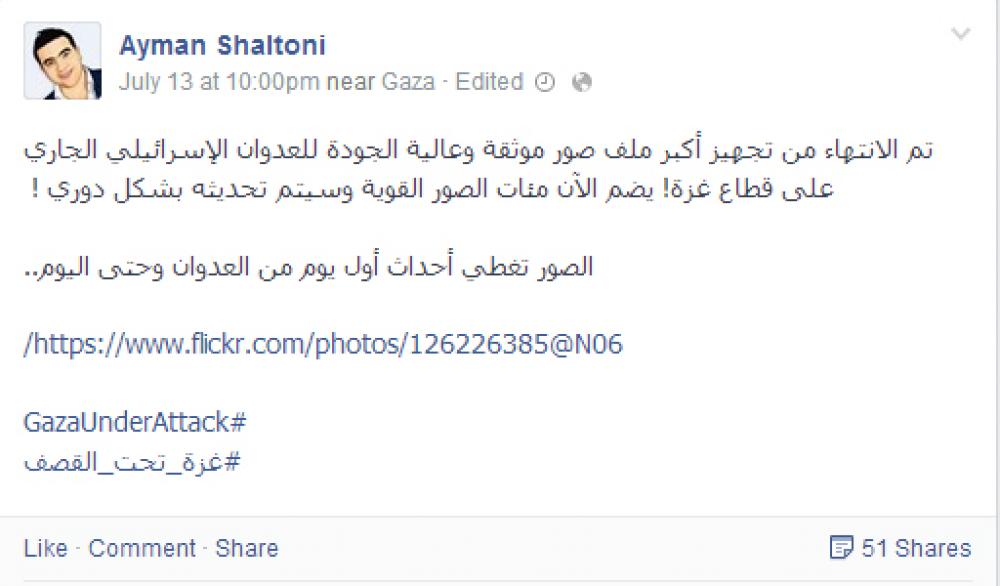 حظي ملف الصور الخاص الذي أعدته وكالة الصحافة الفلسطينية-صفا- منذ يومين للعدوان الإسرائيلي المتواصل على قطاع غزة بمشاهدة كبيرة جدًا. وزار هذا الملف الذي يضم مئات الصور ذات الجودة العالية المحدثة على مدار الساعة أكثر 2219180 زائر خلال يومين فقط. ويعد هذا الملف أكبر ملف صور موثقة عالية الجودة للعدوان الإسرائيلي الجاري على قطاع غزة، حيث يغطي صور أحداث أول يوم من العدوان وحتى الساعة. ويعمل على تحديث هذا الملف طاقم من المصورين والفنيين والمترجمين من جميع محافظات قطاع غزة لتغطية مئات الغارات وعمليات القصف المتواصلة على قطاع غزة لليوم الـ10 على التوالي. https://www.flickr.com/photos/126226385@N06/ #GazaUnderAttack #غزة_تحت_القصف صور بعض المشاركات
