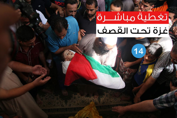 يواصل جيش الاحتلال الإسرائيلي لليوم الـ14 على التوالي عدوانه واسع النطاق على قطاع غزة ما أدى لاستشهاد 450 مواطنًا بينهم 112 أطفال، 41 امرأة و25 من المسنين. وأسفر عدوان الاحتلال عن إصابة ما يزيد عن 3070 مواطنا منهم 904 أطفال و533 من السيدات و25 من المسنين. وارتكب الاحتلال 32 مجزرة بحق عائلات استشهد ثلاثة وأفراد أكثر منها. وبدأ الاحتلال عملية برية محدودة مساء الخميس الماضي قال إنها تستهدف الأنفاق المنتشرة على الشريط الحدودي شرق قطاع غزة، وشن بالتزامن مع هذا الاعلان قصفا عنيفا من البر والجو والبحر طال كل شيء في قطاع غزة. وتستهدف طائرات الاحتلال بشكل مكثف وعلى مدار الساعة منازل سكنية وأراض زراعية ملاصقة لمنازل المواطنين، وفيما يلي تطورات الأحداث لحظة بلحظة: [color=red]01:10[/color] مراسلنا: إطلاق قذائف دخانية شمال قرية ام النصر شمال قطاع غزة 00:00 الصحة: استشهاد المواطنة منوة عبد الباسط أحمد السبع (37 عامًا) بقصف على بيت حانون شمال قطاع غزة [color=red]23:50[/color] مراسلنا: قصف مكثف من الزوارق على سواحل السودانية شمال غرب قطاع غزة [color=red]23:30[/color] قصف خلف محطة شعث للبترول قرب مفترق السامر وسط مدينة غزة واشتعال النيران في المكان [color=red]23:15[/color] مراسلنا: استهداف أرض زراعية شمال رفح جنوب قطاع غزة [color=red]22:45[/color] مراسلنا: قوات الاحتلال تطلق فوانيس إنارة فوق بلدة بيت حانون شمال القطاع، وسقوط إحدها في أرض زراعية قرب بلدية بيت حانون واندلاع حريق في المكان [color=red]22:25[/color] قصف مدفعي على أراض زراعية بالنصيرات والبريج وسط قطاع غزة [color=red]22:20[/color] طائرات بدون طيار تستهدف منزلًا لعائلة أبو طالب بالنصيرات وسط القطاع [color=red]22:05[/color] مراسلنا: 3 إصابات إحداها بالغة الخطورة في قصف لمنزل بحي تل الهوى جنوب غرب مدينة غزة [color=red]21:57[/color] قذيفة مدفعية سقطت قرب محطة ابو شباك في جباليا البلد ولا اصابات [color=red]21:45[/color] طائرة حربية تدمير منزلا لعائلة زقوت في حي الزيتون [color=red]21:42[/color] انتشال طفل وامرأة أحياء من تحت انقاض منزل ابو جامع شرق خانيونس [color=red]21:26 [/color]طائرة استطلاع تطلق صاروخا على منزل رزق الحويطي في مخيم 2 بالنصيرات [color=red]21:19 [/color]عشرات القذائف تتساقط على بيارة أبو حجير شرق البريج [color=red]21:03[/color] 3 شهداء وعدد كبير من المفقودين بتدمير منزل توفيق ابو جامع في بني سهيلا بخانيونس [color=red]20:49[/color] إصابات باستهداف مجموعة مواطنين بحي الشجاعية شرق مدينة غزة بقذيفة مدفعية [color=red]20:36[/color] طائرات الاحتلال تدمر بعدة صواريخ منزلا لعائلة دلول بحي الزيتون [color=red]20:24[/color] غارة على ارض زراعية في محيط مسجد أصلان غرب بيت لاهيا ولا اصابات [color=red]20:18[/color] استشهاد الطفل ريان تيسير ابو جامع 8 سنوات والمسنه فاطمة محمود ابو جامع و3 اصابات متوسطة جراء استهداف شرق محافظة خانيونس [color=red]20:09[/color] قصف عنيف من طائرة حربية خلف مدرسة تل الزعتر في بيت لاهيا [color=red]19:56[/color] سقوط قذيفة مدفعية على منزل أ.غسان وشاح بالوسطى [color=red]19:47[/color] استشهاد عبد الرحمن أحمد أبو تيم في قصف مدفعي شرق خان يونس [color=red]19:34[/color] طائرة استطلاع تطلق صاروخا تجاه منزل إياد كفينة بالنصيرات [color=red]19:31 [/color]طائرة إسرائيلية تستهدف منزلا لعائلة الزعانين ببيت حانون [color=red]19:27[/color] طائرات الاحتلال تستهدف أرضا زراعية ثانية في جباليا [color=red]19:25[/color] طائرة حربية تقصف أرضا زراعية لعائلة النذر بجباليا [color=red]19:25[/color] الصحة: شهداء قصف منطقة الرمال: هاني محمد الحلاق، وسعاد الحلاق، وساجي الحلاق، وابراهيم خليل عمار، واحمد ياسين [color=red]19:24[/color] إصابتان باستهداف أراض زراعية في منطقة العطاطرة بشمال القطاع [color=red]19:19[/color] القدرة: ارتفاع عدد الشهداء في قصف احدى الشقق السكنية بغزة إلى 8 شهداء [color=red]19: 15[/color] القدرة: ارتفاع عدد الشهداء في قصف احدى الشقق السكنية إلى 6 شهداء مع وصول شهيد طفل [color=red]19:9 [/color]طائرات الاحتلال تقصف منزلا لعائلة حمودة في بيت لاهيا [color=red]19:06[/color] ارتفاع حصيلة استهداف برج سكني في حي الرمال وسط غزة إلى ثلاثة شهداء وأكثر من 15 