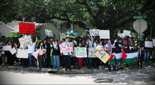 شاركت جماهير الجالية الفلسطينية والعربية والطلبة في مدينة هيوستن الأميركية بمسيرة تضامنية لدعم أهالي قطاع غزة، وتنديدًا بالعدوان الإسرائيلي المتواصل لليوم السادس عشر على التوالي. وتجمهر أكثر 2000 شخص على ثلاثة مفترقات، للمرة الثالثة منذ بدء العدوان الإسرائيلي، وهم يلوحون بالأعلام الفلسطينية، ويحملون اللافتات المنددة بالعدوان مع صور مكبرة لأطفال شهداء. وهتف المتظاهرون بمكبرات الصوت لغزة ولشهدائها، ورددوا الأناشيد الوطنية الفلسطينية، داعين المجتمع الدولي إلى التدخل الفوري لوقف القصف الوحشي لطائرات الاحتلال ضد أبناء الشعب الفلسطيني في قطاع غزة. وطالبوا الحكومة الأميركية والرئيس باراك أوباما بوقف الدعم المادي والسياسي اللامحدود "لإسرائيل"، وألا يتم تبرير الهجوم الوحشي الإسرائيلي بالدفاع عن النفس. من جهتها، أعلنت المؤسسات المنظمة مواصلة فعاليات الدعم والتأييد، ومن المقرر تنفيذ مظاهرة يوم الجمعة المقبل في هيوستن، والسبت في أوستن العاصمة السياسية لتكساس، ومختلف مدن الولاية تحت عنوان "تكساس تقف مع غزة". كما ستنظم مظاهرة كبرى أمام البيت الأبيض في واشنطن على مستوى الولايات المتحدة الأميركية.