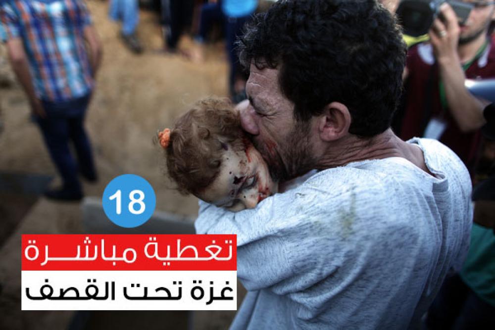 يواصل جيش الاحتلال الإسرائيلي لليوم الـ18 على التوالي عدوانه واسع النطاق على قطاع غزة ما أدى لاستشهاد أكثر من 802 مواطنا، منهم 190 طفلا و 75 سيدة و 40 مسن، فيما جرح 5118 منهم 1561 طفلا و1012 سيدة و203 مسن. ويواصل الاحتلال شن عشرات الغارات الجوية المكثفة على كافة مناطق قطاع غزة مترافقا مع قصف مدفعي مكثف. وفيما يلي تطورات الأحداث لحظة بلحظة: [color=red]23:40[/color] 4 إصابة 6 أشخاص بينهم مسعفين بإطلاق طائرات بدون طيار 4 صواريخ على سيارة إسعاف كانت في طريقها من مشفى ناصر إلى غزة الأوربي، إضافة لإصابة مواطنين اثنين بإطلاق صاروخين على منزلين بخانيونس [color=red]23:15[/color] قصف مدفعي عنيف شمال مخيم النصيرات وسط قطاع غزة [color=red]23:05[/color] طائرات الاحتلال تدمير منزلًا لعائلة حمودة ببيت لاهيا شمال قطاع غزة واندلاع حريق في المكان [color=red]23:00[/color] إصابات باستهداف منزل لعائلة أبو مشعل بدير البلح وسط قطاع غزة [color=red]22:25[/color] مراسلنا: إصابتان بتدمير طائرات حربية منزلًا لعائلة فتوح بحي النصر غرب مدينة غزة [color=red]21:45[/color] استهداف أرض زراعية شرق مخيم البريج وسط قطاع غزة [color=red]21:20[/color] الصحة: شهيد قصف حي الزيتون جنوب مدينة غزة هو إبراهيم جهاد أبو لبن (27 عامًا) [color=red]21:10[/color] طائرات حربية تقصف أرض زراعية في شارع النفق بمدينة غزة [color=red]20:50[/color] شهيد وإصابتان بقصف إسرائيلي على حي الزيتون جنوب مدينة غزة [color=red]20:40[/color] استهداف منزل لعائلة غراب في المنطقة الصناعية بالزوايدة وسط قطاع غزة [color=red]20:35[/color] الصحة: استشهاد 5 مواطنين بقصف إسرائيلي قبل قليل بمحافظة خانيونس وهم: محمد راتب ابو جزر (26 عاما)، وهشام محمد ابو جزر (23 عاما)، ومحمد فرحان ابو جزر (19 عاما)، ومحمود سلمي ابو رويشد (49 عاما)، وشادي سليمان كوارع (31 عاما) [color=red]19:30[/color] أضرار جسيمة بمستشفى محمد الدرة وحرائق في منازل مواطنين جراء قصف منزل لعائلة الرملاوي بشارع يافا قرب مسجد المحطة بحي التفاح شرق مدينة غزة [color=red]19:23[/color] الصحة: حصيلة العدوان الإسرائيلي المستمر على قطاع غزة حتى اللحظة بلغ 788 شهيدًا و5118 جريح [color=red]19:10[/color] أكثر من 15 إصابة باستهداف أحد المنازل بشارع يافا قرب مسجد المحطة بحي التفاح شرق مدينة غزة [color=red]19:06[/color] مراسلنا: شهيد قصف القرارة هو أحمد يوسف عوض، وشهيدا عبسان هم: هاني جلال عصفور، ومحمد يوسف القرا [color=red]19:05[/color] مراسلنا: استهداف شقتين سكنيتين قرب ملعب فلسطين بحي الرمال غرب مدينة غزة [color=red]19:00[/color] شهداء وإصابتان باستهداف منزل في بلدة القرارة وسط قطاع غزة [color=red]18:55[/color] طائرات الاحتلال تستهدف أرضًا لعائلة الصباغ في منطقة الزرقا قرب مسجد المحطة بمدينة غزة [color=red]18:50[/color] استهداف منزل لعائلة حسونة قرب مدرسة دار الأرقم بحي التفاح شرق مدينة غزة [color=red]18:40[/color] استهداف أرض زراعية في حي السلام برفح جنوب القطاع [color=red]18:30[/color] استهداف منزل لعائلة أبو خديجة في رفح جنوب القطاع [color=red]18:20[/color] غارة للاحتلال على منزل سكني وسط قطاع غزة [color=red]18:08[/color] الاحتلال يستهدف موقع "اليرموك" التابع لكتائب القسام شمال مدينة غزة [color=red]18:00[/color] سبعة شهداء في غارتين لللاحتلال على شرقي خان يونس [color=red]17:45[/color] شهيدان من عائلة الاسطل في قصف الاحتلال لمنزلهم بالقرارة في خانيونس [color=red]17:28[/color] استشهاد المواطنة دعاء رائد ابو عودة 17 عام متأثرة بجراحها التي اصيبت بها في استهداف مركز الايواء في مدرسة "أونروا" [color=red]17:11[/color] وصول جثمان الشهيدة ياسمين احمد ابو مور 27 عام متاثرة بجراحها حيث كانت تعالج في مستشفيات جمهورية مصر العربية [color=red]17:10[/color] استشهاد المواطن محمود سلمي رويشد 50 عام جراء استهداف بمحافظة رفح [color=red]16:58[/color] استشهاد المواطن احمد جميعان أبو حجير 19 عام من البريج بالمحافظة الوسطى [color=red]16:46 [/color]المدفعية الصهيونية تقصف برج الياسمين"3" في مدينة الزهراء وسط قطاع غزة [color=red]16:26[/color] القدرة لصفا:15شهيدا و200 مصاب باستهداف مدرسة تابعة للأونروا ببيت حانون [color=red]16:32[/color] استشهاد محمد سليمان عوكل وجرح اخرين بقصف مجموعة م