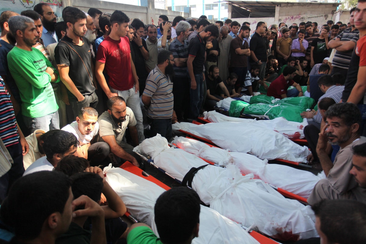 ا[title]رتفعت حصيلة الشهداء الفلسطينيين الذين ارتقوا الخميس إلى نحو 82 شهيدًا جراء العدوان الإسرائيلي المتواصل على قطاع غزة لليوم الثامن عشر على التوالي. وأعلنت وزارة الصحة في غزة أن حصيلة إجمالي شهداء العدوان الإسرائيلي ارتفعت إلى 777 شهيدًا بينهم هم 166 طفلًا و67 سيدة و37 مسنًا، فيما جرح 4750 آخرين منهم 1213 طفلًا 687 سيدة و161 مسنًا. وأعلن الناطق باسم الوزارة أشرف القدرة عن استشهاد 15 مواطنًا وإصابة أكثر من 200 آخرين في مجزرة جديدة ارتكبتها مدفعية الاحتلال بحق مدرسة تابعة لوكالة غوث وتشغيل اللاجئين "أونروا" في بلدة بيت حانون شمال القطاع. [/title] كما جرى في وقت سابق من اليوم انتشال جثامين أربعة شهداء من بلدة خزاعة شرق خان يونس، هم رسمي أبو ريدة، محمد أبو يوسف، أحمد قديح ورامي قديح. وأعلن القدرة عن وصول الشهيد محمد يوسف القاضي (27عامًا) متأثرًا بجراحه حيث كان يعالج في جمهورية مصر العربية، بالإضافة إلى استشهاد المواطن محمد سليمان عوكل (36عامًا) من مدينة رفح. كما استشهد المواطن عبد العزيز نور الدين نور (21عامًا) والشاب سائر عودة شمالي (19عامًا) جراء استهداف مجموعة مواطنين عند سوق الشجاعية، وكذلك الطفل أمير عادل صيام (13سنة)، والشاب عصام فيصل صيام (20عامًا) جراء استهداف مجموعة من المواطنين بمدينة رفح. وجرى وصول جثامين أربعة آخرين من المنطقة الشرقية بمحافظة خان يونس، هم إسماعيل حسن ابو رجيلة (57عامًا)، نافذ سليمان قديح (45عامًا) بدر حاتم قديح (13عامًا)، وحنفي محمود أبو يوسف (42عامًا). واستشهد ظهر اليوم ثلاثة مواطنين جراء استهداف إسرائيلي في بلدة بيت حانون، هم محمد جهاد مطر، آمنة جهاد مطر وتمام محمد حمد، كما جرى انتشال جثماني شهيدين توأم من شهداء مجزرة حي الشجاعية شرق غزة، هما أنس أكرم السكافي (18عامًا) وسعد أكرم السكافي (18عامًا). كما أعلن عن استشهاد مواطنين من منطقة السطر الغربي بمحافظة خان يونس في قصف إسرائيلي، وهما أحمد عبدالكريم أحمد حسن ومحمد إسماعيل خضر، وكذلك استشهاد المواطنة علا خليل ابو عايدة (27عامًا) جراء استهداف أحد المنازل بمدينة الزهراء. وفي السياق ذاته، استشهد المواطن خضر خليل اللوح (50عامًا) جراء استهداف بمنطقة العطاطرة، وإصابة آخرين بجروح مختلفة، وكذلك جرى وصول شهيدين من بلدة خزاعة شرق خان يونس، هما محمد إبراهيم أبو دقة (42عامًا) , وأكرم إبراهيم أبو دقة (50عامًا). وكان استشهد صباح اليوم المواطنين محمد أحمد النجار وشادي النجار بقصف مدفعية الاحتلال للمحاصرين في بلدة خزاعة لحظة خروجهم. وطالبت وزارة الصحة بضرورة توفير حماية دولية للمدنيين المحاصرين شرق خزاعة، والذين يتعرضون للاستهداف المباشر لحظة خروجهم. واستشهد أيضًا الشاب خليل ناصر عطية وشاح (21عامًا) متأثرًا بجروح أصيب بها قبل يومين في المحافظة الوسطى، وكذلك استشهد المواطن أحمد إبراهيم سعيد القرعان (26عامًا) من الزوايدة بالمحافظة الوسطى. وفي السياق ذاته، أعلن الناطق باسم وزارة الصحة عن استشهاد الطفل هادي عبد الحميد عبد النبي عام ونصف جراء قصف مسجد بمنطقة الجرن في جباليا. وارتكبت طائرات الاحتلال مجزرة جديدة بقصفها أحد المنازل غرب خان يونس، ما أدى لاستشهاد كل من ميلاد عمران الأسطل (29عامًا)، محمد عمران خميس الأسطل (33عامًا)، ملك أمين أحمد الأسطل (24عامًا)، أحمد ثائر عمران الأسطل (33عامًا)، أمين ثائر عمران الأسطل (3 أعوام)، وندى ثائر عمران الأسطل (5 أعوام) وفي وقت سابق، استشهد المواطن يزيد سعد البطش (23عامًا) متأثرًا بجراحه التي أصيب بها في مجزرة آل البطش شرق غزة. كما استشهد أربعة مواطنين من عائلة واحدة باستهداف منزلهم في بلدة جباليا شمال القطاع، وهم إبراهيم عبدالله أبو عيطة (67عامًا)، أحمد إبراهيم عبد الله أبو عيطة (30عامًا)، وجميلة سليم أبو عيطة (65عامًا)، والطفل أدهم أحمد أبو عيطة (11عامًا)، وإصابة عشرة آخرين. واستهدفت مدفعية الاحتلال بلدتي عبسان وبني سهيلا في خان يونس، ما أدى إلى استشهاد 7 مواطنين، وهم: بسام خالد أبو شهلا (44عامًا)، أحمد رفعت الرق