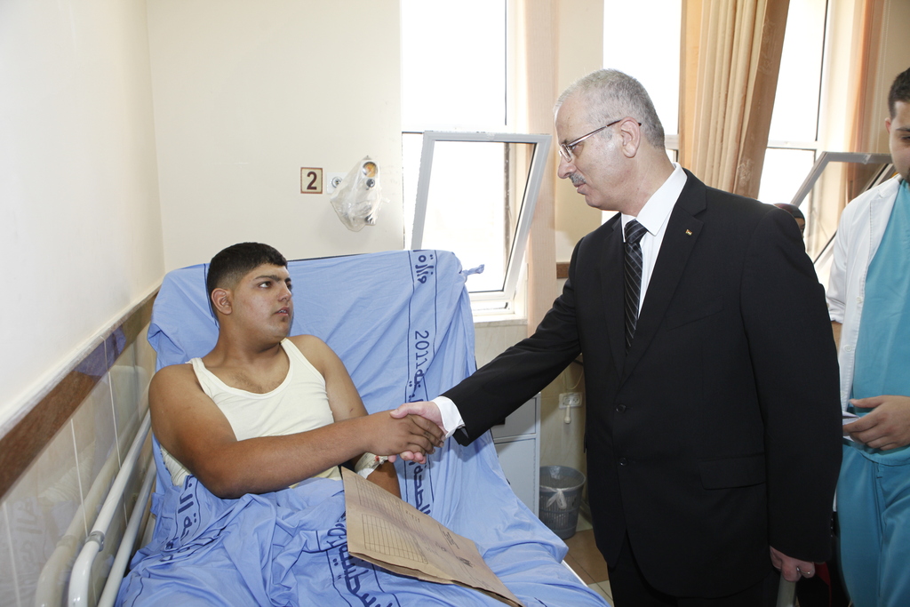 طالب رئيس الوزراء رامي الحمد الله الجمعة بضرورة توفير الحماية الدولية ومحاسبة الاحتلال على مسؤوليتهم من هذه الجرائم. وشدد الحمد الله بخلال زيارة لمجمع فلسطين الطبي تفقد فيها الجرحى الذين أصيبوا قرب حاجز قلنديا على أن جميع المؤسسات الحقوقية تقوم بتوثيق جميع الاعتداءات ضد أبناء الشعب الفلسطيني من أجل محاكمة الاحتلال عليها في المحاكم الدولية. وأكد على أن المجتمع الدولي يجب أن يتوقف عند مسؤولياته بحماية الشعب الفلسطيني من ممارسات الاحتلال الإسرائيلي المتعددة سواء بالقتل والقصف وهدم البيوت طوال ال 48 عام الماضية. وشدد الحمد الله على ضرورة ان يتوقف العالم بسياسة الكيل بمكيالين، فـ"إسرائيل" دولة محتلة وعلى العالم أن ينهي هذا الاحتلال، واعتداءاته سواء في الضفة الغربية وقطاع غزة والقدس والزام "إسرائيل" بتطبيق قرارات الشرعية الدولية.