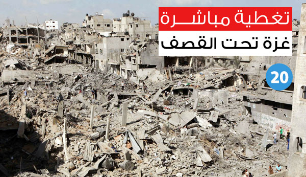 يواصل الاحتلال الإسرائيلي لليوم الـ20 عدوانه واسع النطاق على قطاع غزة ما أدى لاستشهاد 1049 مواطنا، منهم 208 طفلًا و82 سيدة و40 مسن، فيما جرح 5900 منهم 1561 طفلا و1012سيدة و203 مسن. وتشن طائرات الاحتلال عشرات الغارات الجوية المكثفة على كافة مناطق القطاع، مترافقًا مع قصف مدفعي مكثف. وفيما يلي تطورات الأحداث لحظة بلحظة: [color=red]23:00[/color] مراسلنا: الاحتلال يفرج عن 30 معتقلًا من خزاعة شرق خانيونس جنوب قطاع غزة عبر حاجز بيت حانون/ إيرز شمال قطاع غزة [color=red]22:45[/color] الصحة: ارتفاع عدد الشهداء الذين تم انتشالهم اليوم من مناطق متعددة بقطاع غزة إلى 147 شهيدًا [color=red]22:30 [/color]الاحتلال يسلم لمشفى كمال عدوان 16 مصابا كان اعتقالهم من خان يونس قبل أيام [color=red]22:00[/color] استشهاد نعيم أبوظاهر 36 عاما برصاص الاحتلال شرق دير البلح وقت المغرب [color=red]20:25 [/color]مراسلنا: انقاذ 5 جرحى من تحت أنقاض الركام بمنطقة آل رضوان بخزاعة شرق خانيونس جنوب قطاع غزة [color=red]19:20[/color] مراسلنا: سيارات الإسعاف تتمكن من الدخول إلى خزاعة شرق خانيونس الآن لإخلاء الشهداء والجرحى [color=red]17:30[/color] مراسلنا: انتشال 11 شهيدًا من عائلة الحلو بالشجاعية بينهم أطفال [color=red]15:25[/color] قوات الاحتلال تواصل منع دخول مسعفين لبلدة خزاعة بغزة لإنتشال الجثث رغم التهدئة [color=red]14:52[/color] مراسلنا: انتشال 3 شهادء من شرق رفح [color=red]12:58[/color] ارتقاع عدد الشهداء الى 953 شهيد وذالك بعد انتشال 73 شهيد من مختلف مناطق قطاع غزة منذ صباح اليوم [color=red]11:28[/color] الاحتلال: تم قصف 3670 هدفًا في قطاع غزة منذ بدء الحرب [color=red]10:17[/color] مراسلنا: وصول 9 شهداء للمشفى الأوروبي بخان يونس، بينهم 3 من خزاعة [color=red]10:16[/color] مراسلنا: انتشال 15 شهيد من مناطق شمال قطاع غزة إلى مشفى كمال عدوان [color=red]9:32[/color] الصحة: حصيلة شهداء اليوم الـ20 من العدوان بلغ 35 شهيدًا ليرتفع الاجمالي لـ 900 [color=red]9:18[/color] سكان بخزاعة يناشدون عبر "صفا" الصليب الاحمر للتدخل العاجل والتنسيق من أجل انتشال شهداء وجرحى العدوان بداخلها [color=red]9:18[/color] الاحتلال يمنع الطواقم الطبية من دخول بلدة خزاعة المنكوبة لانتشال شهداء وجرحى العدوان عليها [color=red]9:06[/color] الصحة: انتشال جثامين 5 شهداء من المنطقة الشرقية للمحافظة الوسطى عرف منهم: عبد الرحمن عوده التلباني - عرفات ابو عويلي- و3 مجهولي الهوية [color=red]8:53 [/color]الصحة: انتشال جثامين المواطنين نضال أحمد عيسى أبو العسل (27عاما) وسليم سلام ابو التوم (87عامًا) من شرق رفح [color=red]8:45[/color] انتشال جثامين 4 شهداء من المغازي وخامس من شرق رفح بعد بدء التهدئة [color=red]7:55[/color] قبيل بدء التهدئة الإنسانية.. جيش الاحتلال يكثف من عدوانه على قطاع غزة [color=red]7:44[/color] اشتداد القصف المدفعي المكثف والعنيف على أراض ومنازل المواطنين شرق القطاع [color=red]7:30[/color] تواصل القصف المدفعي الإسرائيلي المكثف على طول الشريط الشرقي للقطاع [color=red]7:07[/color] طائرات الاحتلال تقصف أراض زراعية في محيط تبة الريس بجحر الديك وسط القطاع مرتين [color=red]6:42[/color] طائرات إسرائيلية تستهدف منزلا لعائلة قاسم وتدمره على رؤوس ساكنيه بمنطقة زمو ببيت حانون [color=red]6:28[/color] استهداف منزل لعائلة التعابين في منطقة الزوايدة ولا إصابات [color=red]6:05[/color] مراسلنا: استهداف منزل يعود لعائلة شتات شرق حي الشيخ رضوان بغزة [color=red]5:53 [/color]غارة إسرائيلية على أرض زراعية بمحيط موقع كوسوفيم شرق القرارة [color=red]5:41 [/color]استشهاد المواطن محمد سعيد البابا (40عاما) متأثرًا بجراحه بقصف منزل عائلة ورش أغا ببيت لاهيا [color=red]5:36 [/color] مراسلنا: ارتفاع عدد شهداء مجزرة عائلة النجار بخانيونس إلى 20 [color=red]5:25[/color] طائرة حربية تستهدف منزل الشهيد أبو حسن قنديل غرب المغازي بـ3 صواريخ [color=red]5:20[/color] مراسلنا: استهداف عدة أراض زراعية غرب ووسط المغازي [color=red]5:13[/color] مراسلنا: قصف مدفعي إسرائيلي مكثف وعنيف على شرق الوسطى [color=red]5:02[/color] القدرة: ارتفاع حصيلة شهداء عائلة النجار الى 12 شهيدا [color=red]7:51[/color] الزوارق البحرية تطلق حممها على ساحل بحر غزة [color=red]04:25[/color]15 م