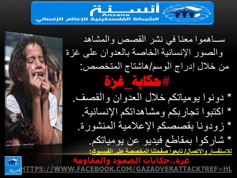 أطلقت الشبكة الفلسطينية للإعلام الإنساني "أنسنة" وسمًا متخصصًا حول العدوان الإسرائيلي على قطاع غزة حمل عنوان "#حكاية_غزة"، ليكون أول وسم غير إخباري متخصص في توثيق ورواية قصص الصمود والمقاومة التي يبديها الفلسطينيون في القطاع خلال العدوان المتواصل. وقال رئيس تحرير الشبكة محسن الإفرنجي في بيان صحفي السبت إن "الوسم الجديد (هاشتاق HASHTAG) يركز على توثيق القصص الإنسانية ويوميات العدوان، ومشاهد ولقطات إنسانية خلال العدوان الإسرائيلي, وذلك من خلال النصوص والوسائط المتعددة المختلفة". وأضاف أنه رغم كثرة الوسوم التي انطلقت خلال العدوان على غزة، إلا أن ما يميز هذا الوسم هو التخصص، حيث يركز فقط على نشر تغريدات وبوستات متعلقة بالجانب الإنساني، دون التركيز على الأخبار العاجلة والمتلاحقة المتعلقة بمجريات العدوان على غزة وتصدي المقاومة الفلسطينية له. وأوضح دور شبكات التواصل الاجتماعي برز بصورة واضحة خلال العدوان الأخير على غزة، حيث تدار معركة إعلامية افتراضية أخرى عبر تلك الشبكات من أجل فضح جرائم الحرب الإسرائيلية، وحشد التأييد لغزة، ودعم مقاومتها والتصدي للشائعات التي تروجها "إسرائيل" وحلفائها. ومن أشهر الوسوم التي تداولها الناشطون خلال العدوان هي "#غزة_تحت_القصف"، "#غزة_تقاوم"، وبالإنجليزية وسم "#GAZAUNDERATTACK "، ووسم "#PRAYFORGAZA"، كما برز مؤخرًا الوسم الذي أطلقته فضائية الجزيرة وهو "#"AJAGAZA. وحث الإفرنجي المدونين والناشطين على زيادة عدد التغريدات والتعليقات لإنتاج المزيد من القصص الإنسانية, وكتابة يومياتهم خلال العدوان لتظهر للعالم كيف يعيش الفلسطينيون خلال العدوان, وكيف يقضون ساعاتهم وينامون ويأكلون ويؤدون مناسك العبادة في رمضان تحت تهديد القصف المتواصل عليهم ليل نهار. وأعرب عن أمله بتدشين صفحة متخصصة تروي حكايات الحياة والموت تحت القصف والدمار في غزة بلغات أخرى خاصة الإنجليزية, ليطلع العالم على تفاصيل ومجرات حياة ومعاناة الغزيين في ظل الاحتلال وعدوانه المتواصل. وأوضح أن الشبكة تعتمد في تزويد الوسم بالتغريدات والتعليقات على المصادر الإعلامية المنشورة, حيث يتم اختيار القصص المميزة لنشرها في الصفحة المخصصة لهذا الغرض, إلى جانب دعوة النشطاء والمدونين والمواطنين لكتابة تجاربهم الإنسانية ووصف مشاهد من حياتهم بطريقة مختصرة خلال العدوان, وما أحدثه من تأثيرات مختلفة على جوانب حياتهم. وتزامنًا مع إطلاق الهاشتاق الجديد, ذكر الإفرنجي أن شبكة "أنسنة" أطلقت صفحة متخصصة على شبكة الفيسبوك بعنوان "غزة.. حكايات الصمود والمقاومة"، وهي صفحة متخصصة في توثيق القصص الإنسانية والفيديوهات والصور الخاصة بالعدوان على غزة، مع التركيز على محوري الصمود والمقاومة.