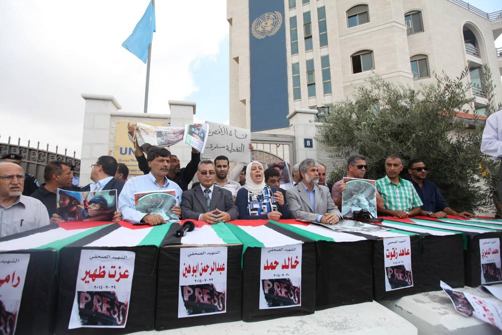 نظمت نقابة الصحفيين الفلسطينيين بمشاركة نقابات ومؤسسات في مدينة رام الله ظهر الثلاثاء مسيرة توابيت رمزية للشهداء الصحفيين الذين قضوا في العدوان الإسرائيلي على قطاع غزة. وشارك في المسيرة التي انطلقت أمام مركز أبو ريا للتأهيل باتجاه مقر الأمم المتحدة، أكثر من مئة صحفي فلسطيني من مختلف مدن الضفة الغربية. ورفع المشاركون بالمسيرة صور الصحفيين الذين قضوا في العدوان على غزة، إلى جانب صور الضحايا من الأطفال والنساء، ومظاهر الدمار التي تعرض لها القطاع بفعل الغارات الوحشية خلال 30 يومًا من العدوان المتواصل. ودعوا الهيئة الدولية لمحاسبة الاحتلال على جرائمه غير المسبوقة، والتي ارتكبت بحق الصحفيين والمدنيين والآمنين في قطاع غزة. من جهته، طالب نقيب الصحفيين عبد الناصر النجار مصر بالإسراع بفتح معبر رفح لدخول لجان تحقيق دولية للكشف عن ممارسات الاحتلال الاجرامية بحق الصحفيين، واستهداف بعض المكاتب الإعلامية والطواقم التي عملت خلال فترة الحرب. ودعا الجسم الصحفي الفلسطيني للاستمرار بفضح جرائم الاحتلال للرأي العام العالمي، لافتًا إلى أنه تم تسليم الأمين العام للأمم المتحدة بان كي مون رسالة لوضعه بصورة ما يحدث في قطاع غزة بحق المواطنين والصحفيين. يذكر أن نحو 12 صحفيًا استشهدوا خلال العدوان الإسرائيلي على قطاع غزة، كما تم تدمير وقصف (16) منزلًا للصحفيين، واستهداف (15) مقرًا إعلاميًا.